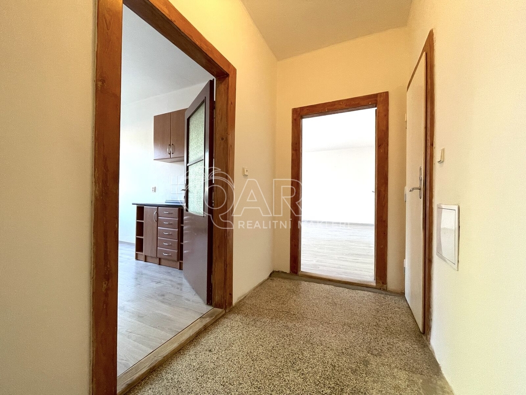 Dispozice bytu zahrnuje chodbu, prostorný pokoj a samostatnou kuchyň s linkou, elektrickým sporákem + spíž. Koupelna přístupná z pokoje je vybavena vanou, toaleta je samostatná. Vytápění zajišťuje plynový kotel, okna jsou dřevěná.
