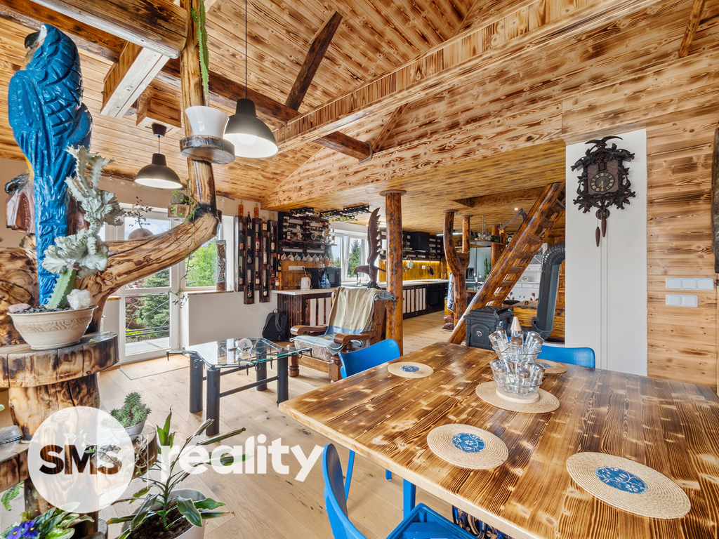 Byt je kompletně obložen kvalitním dřevem opáleným ohněm, které mu dodává atmosféru stylového horského srubu. Dominantou obytného prostoru jsou krbová kamna, která nejen efektivně vytápí celý byt, ale vytváří i jedinečnou atmosféru domova.