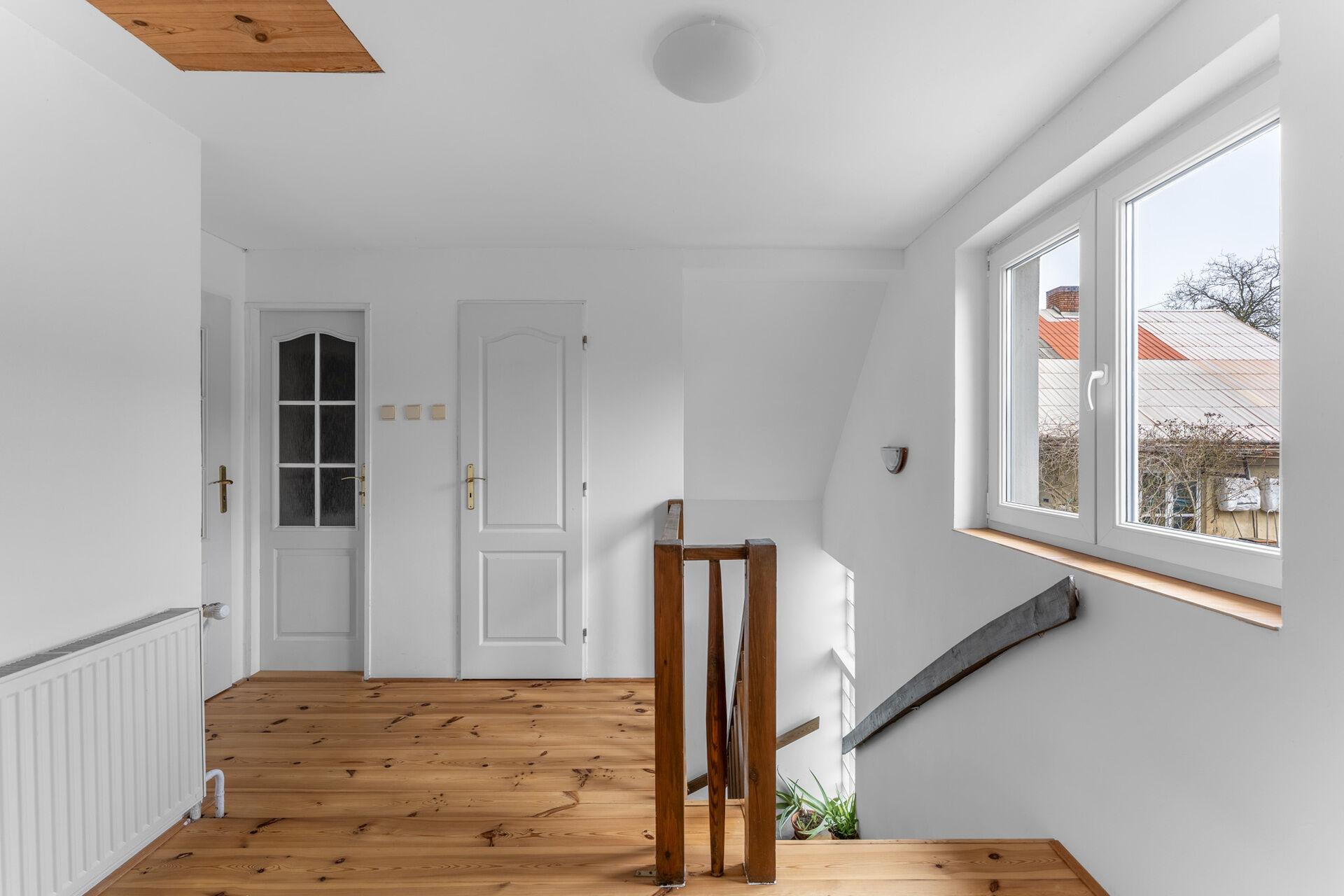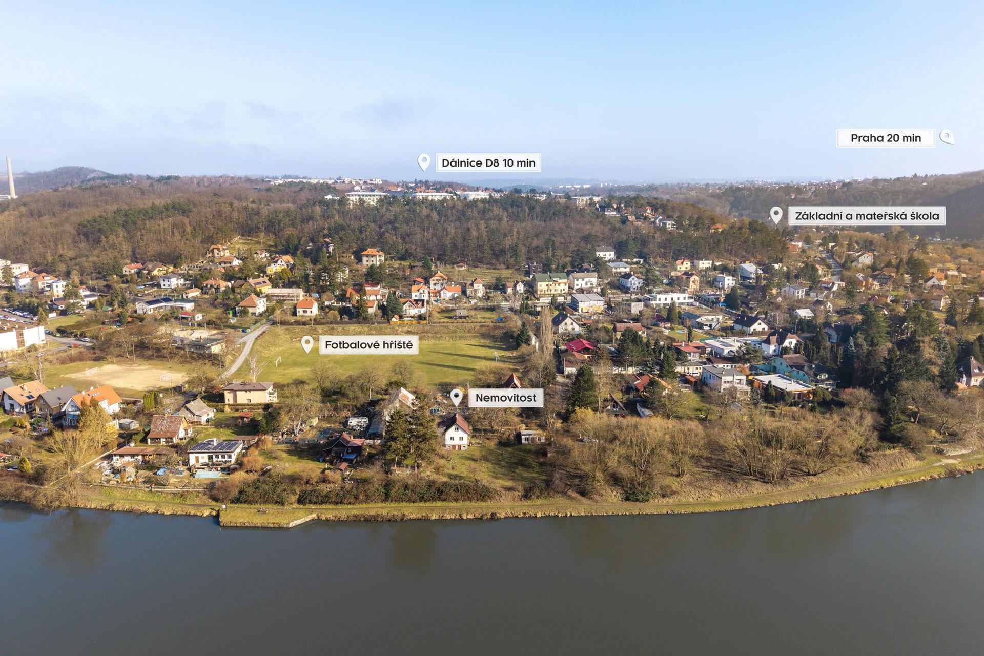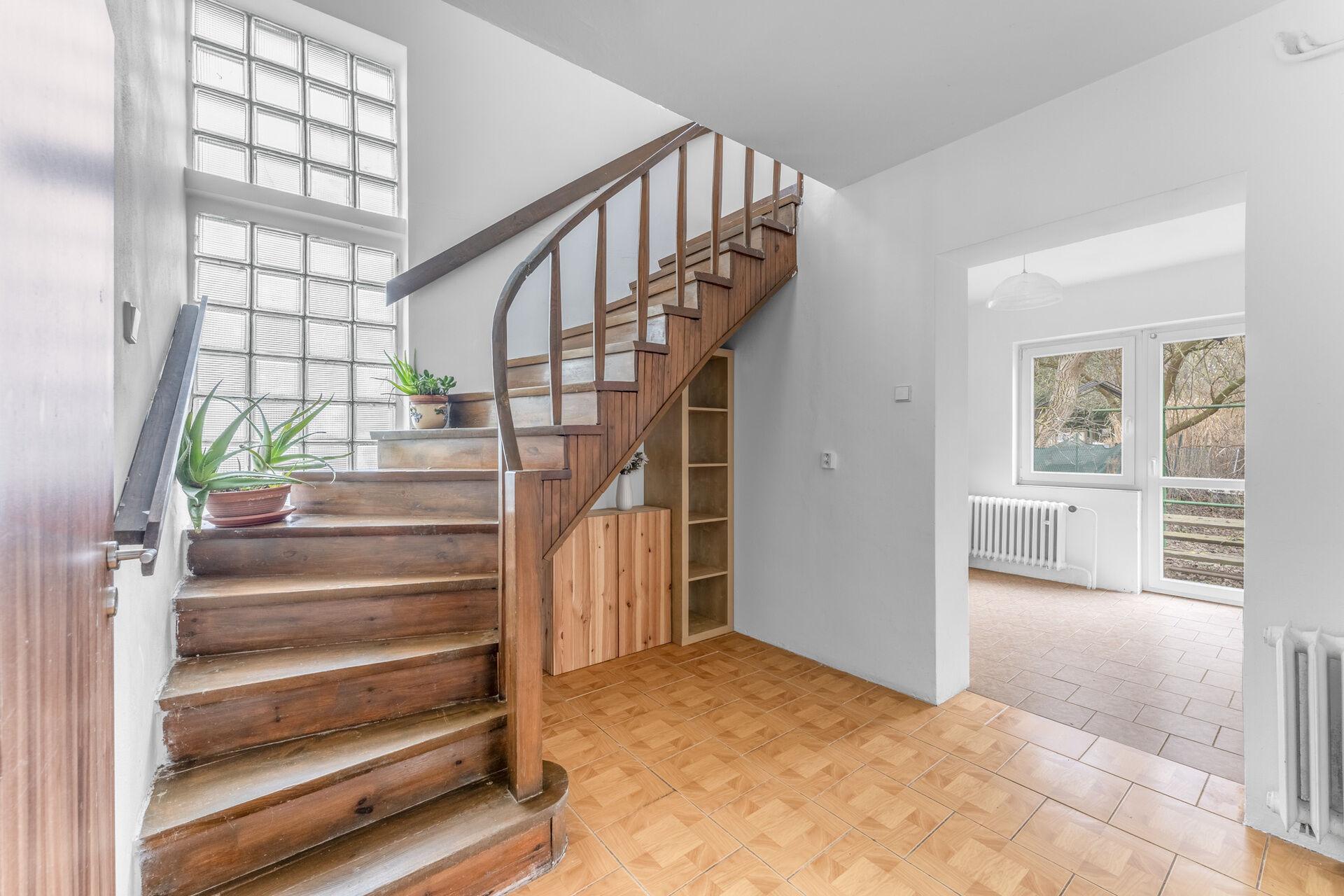 V prvním nadzemním podlaží se nachází hlavní místnost domu, obývací pokoj orientovaný do zahrady s výhledem na Vltavu, dále samostatná kuchyně, která je po rekonstrukci, je z ní přímý vstup na terasu a je plně vybavená, nechybí sporák, myčka, lednice s mrazákem či digestoř. Na patře dále najdete předsíň a koupelnu, která disponuje vanou, sprchou a toaletou. Druhé podlaží se skládá z prostorné chodby, samostatného WC, menší místnosti v podkroví, která v minulosti sloužila jako dětský pokoj, nyní je spíše vhodná jako úložný prostor a v neposlední řadě velké ložnice.