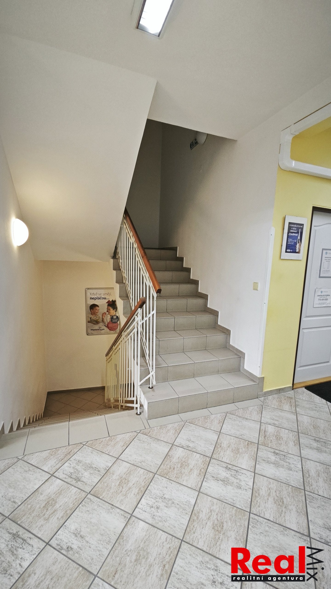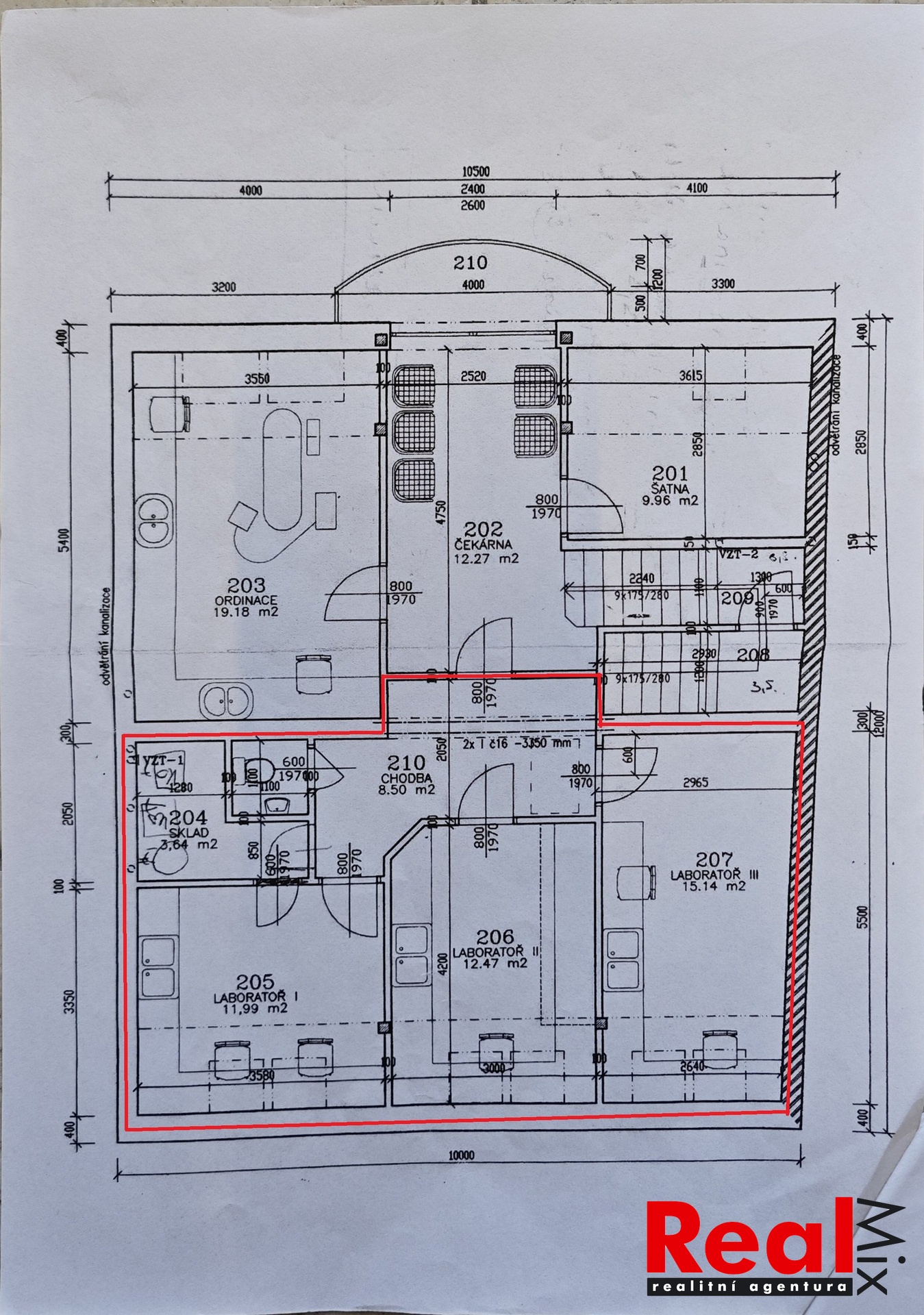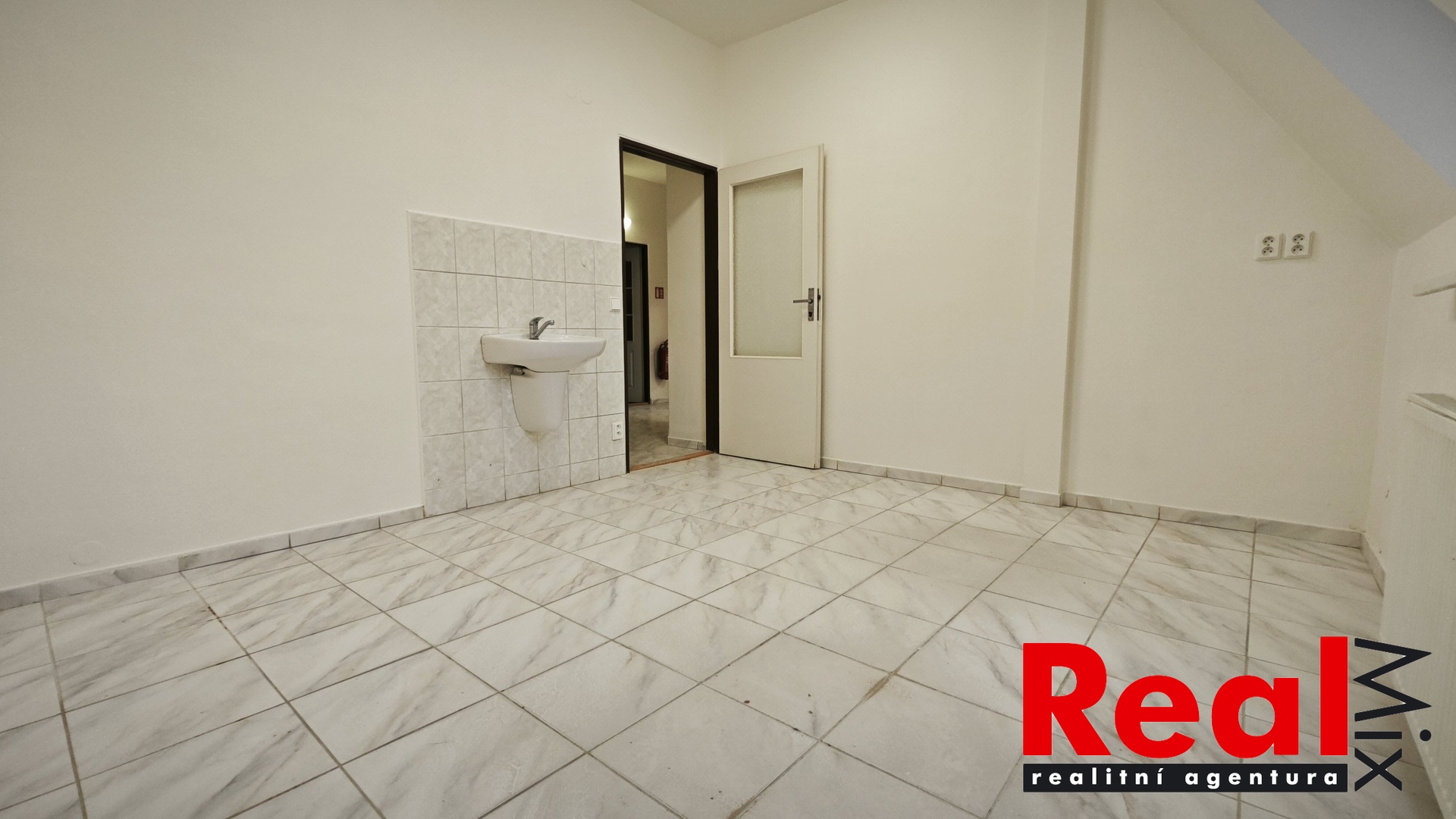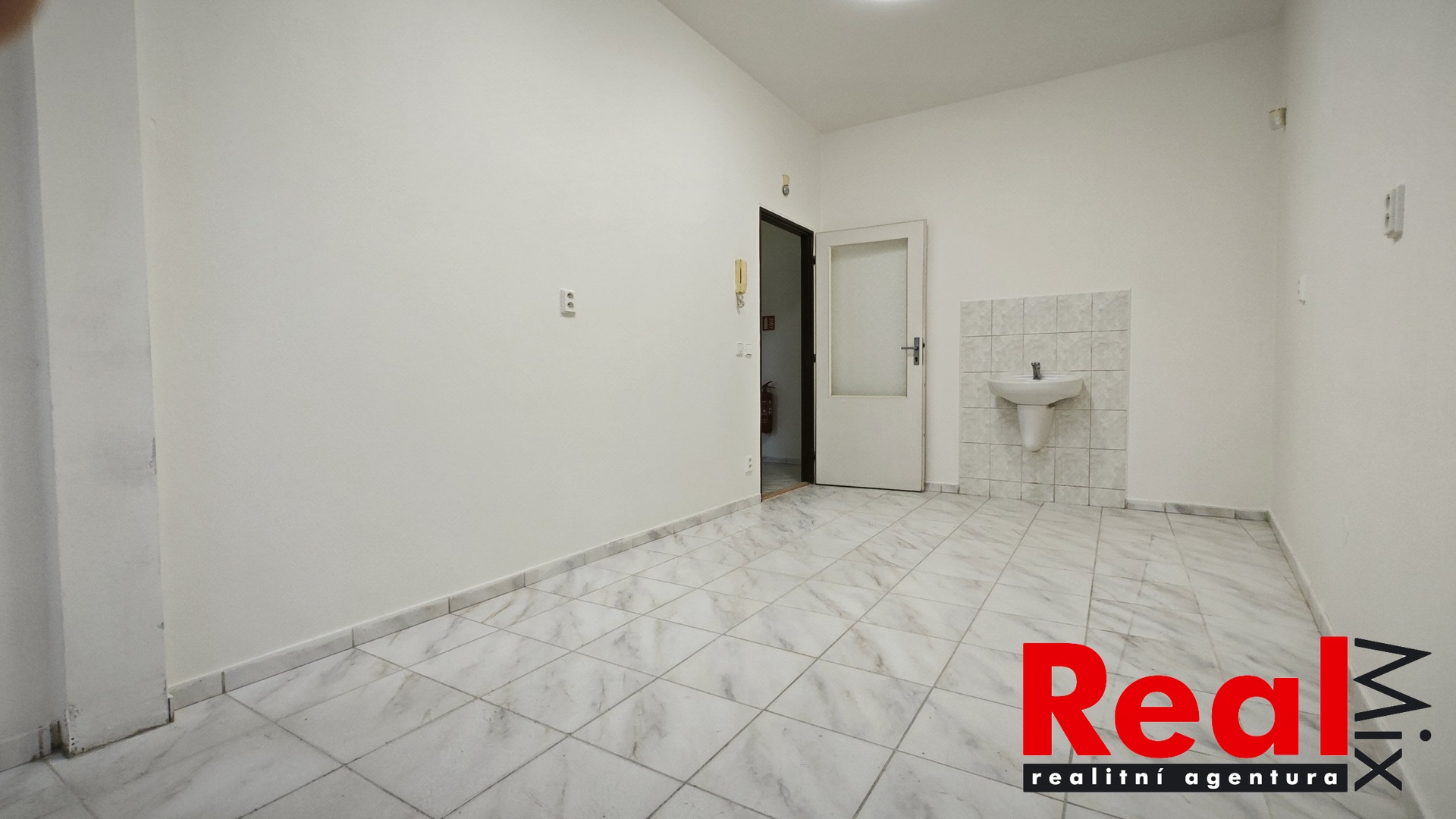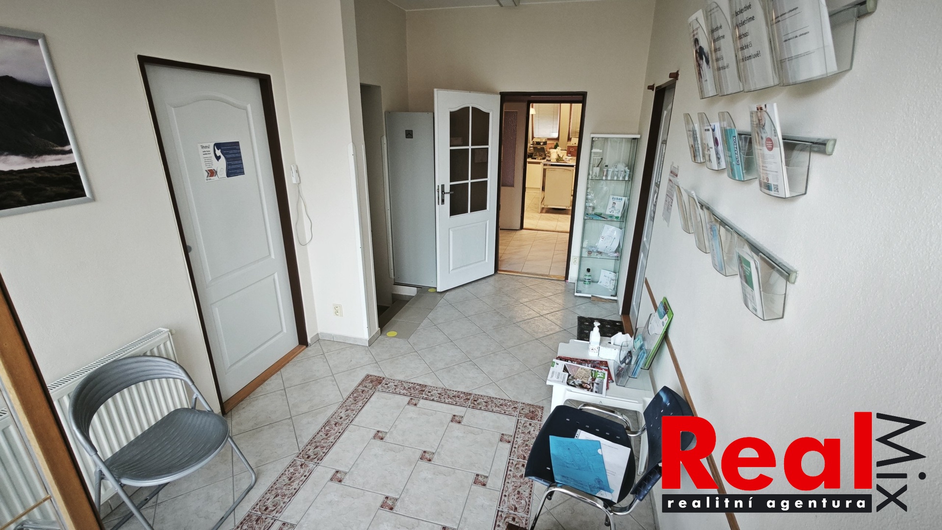 Dispozice: sdílená čekárna/předsálí 12m2, kanceláře 15 + 13 + 12m2, sklad 3,6m2, sklad 3,2m2, předsíň/vstupní hala 8,5m2, WC s umyvadlem 1,2m2, možnost využití sdílené šatny. V každé místnosti je umyvadlo s teplou a studenou vodou.