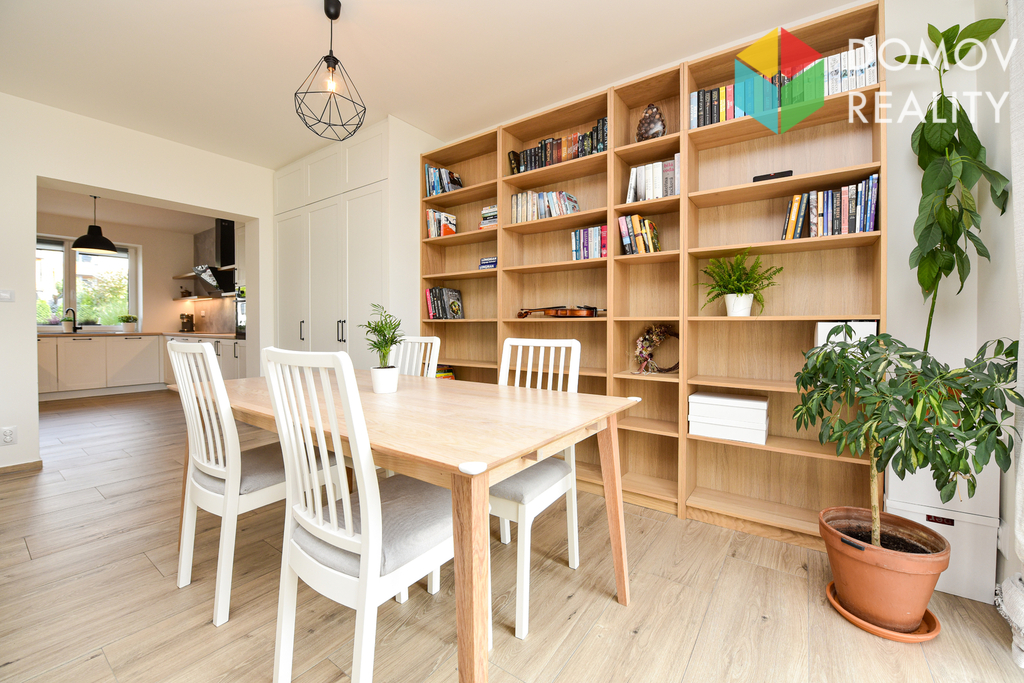 Dům má vše, co moderní rodina požaduje – prostorný světlý obývací pokoj, nadstandardně vybavenou kuchyňskou linku do tvaru U, 3 samostatné ložnice, 2 toalety, podlahové vytápění, krbová kamna, venkovní žaluzie a parkování na vlastním pozemku. Velkým francouzským oknem se dostanete na terasu a zahradu, odkud je výhled na zelené kopce nad Berounkou. Na pozemku je zahradní domek a sklad, které vyřeší úložné prostory. Další možnosti ukládat sezonní věci jsou na prostorné, částečně pochozí, půdě.