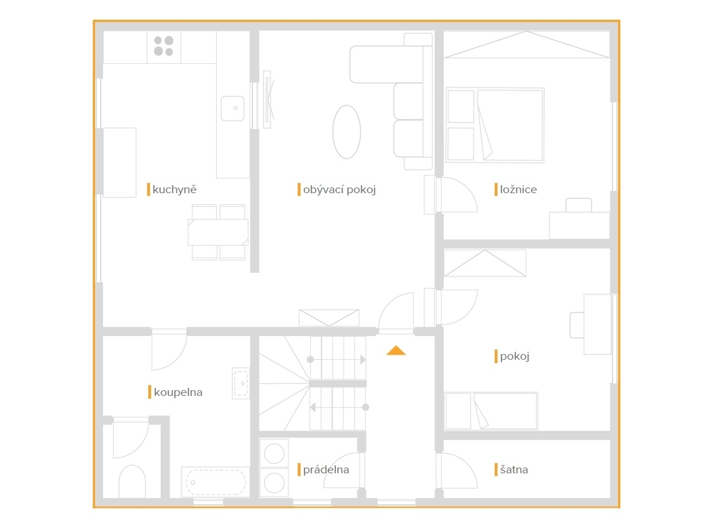 - kuchyňská linka + varná deska, digestoř, trouba, mikrovlnná trouba, lednice, myčka, stůl, židle,