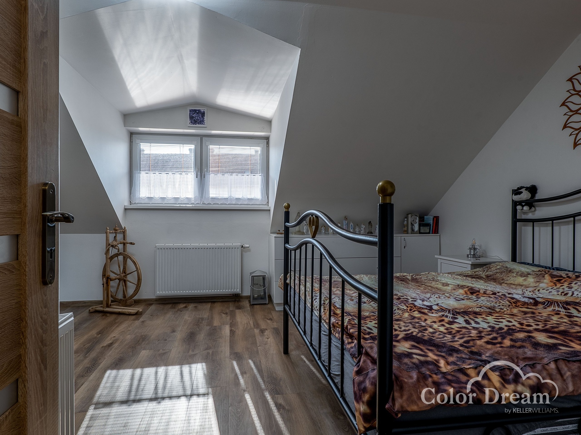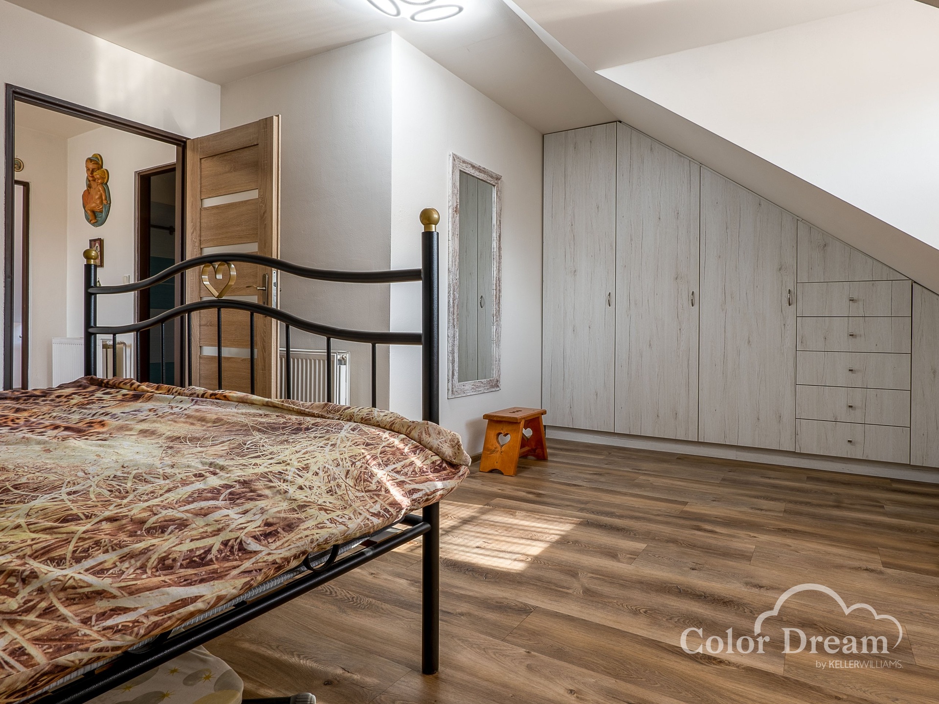 V patře je ložnice s vestavěnými skříněmi, další pokoj, koupelna s rohovou vanou, sprchovým koutem i WC.