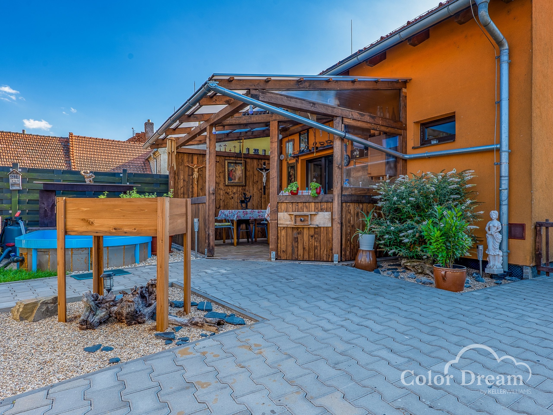 Ve dvoře je dřevěná pergola skvělá k relaxaci a venkovnímu posezení, bazén, v zadní části dvora je garáž (cca 30 m2). Na dvůr a do garáže je možný vjezd. Parkování je možné i na komunikaci před domem.