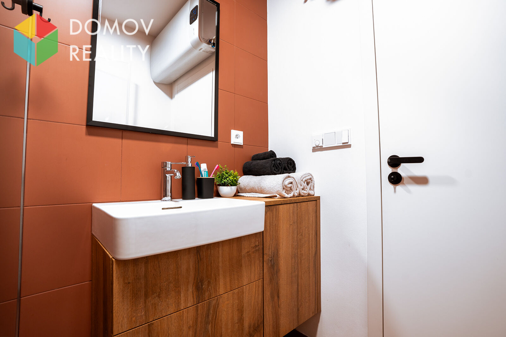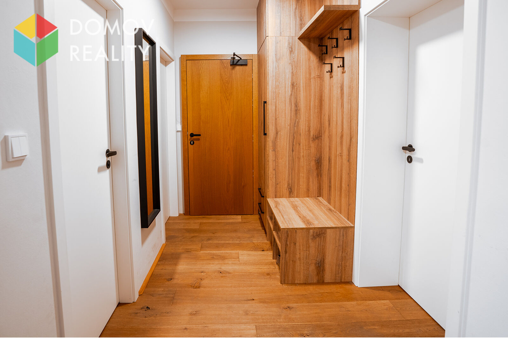 Dispoziční členění: vstupní chodba ve které jsou umístěné vestavěné skříně, kuchyňský kout zařízen moderní kuchyňskou linkou se spotřebiči na níž volně navazuje obývací pokoj, vybavená ložnice s vestavěnými skříněmi , koupelna zařízena sprchovým koutem, WC samostatně.
