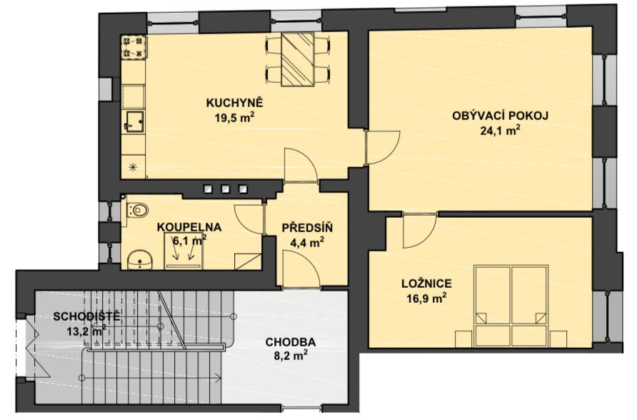 Dispozice bytu tvoří vstupní předsíň, dva samostatné pokoje, obývací prostor s kuchyňským koutem, koupelna se sprchovým koutem, umyvadlem a WC. K bytu náleží sklepní kóje o velikosti 4,5 m.