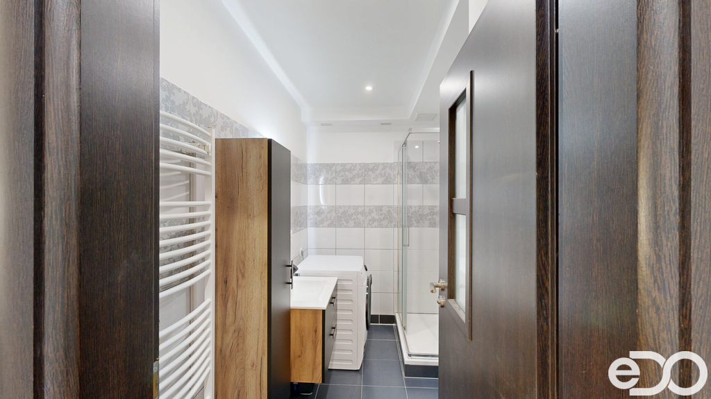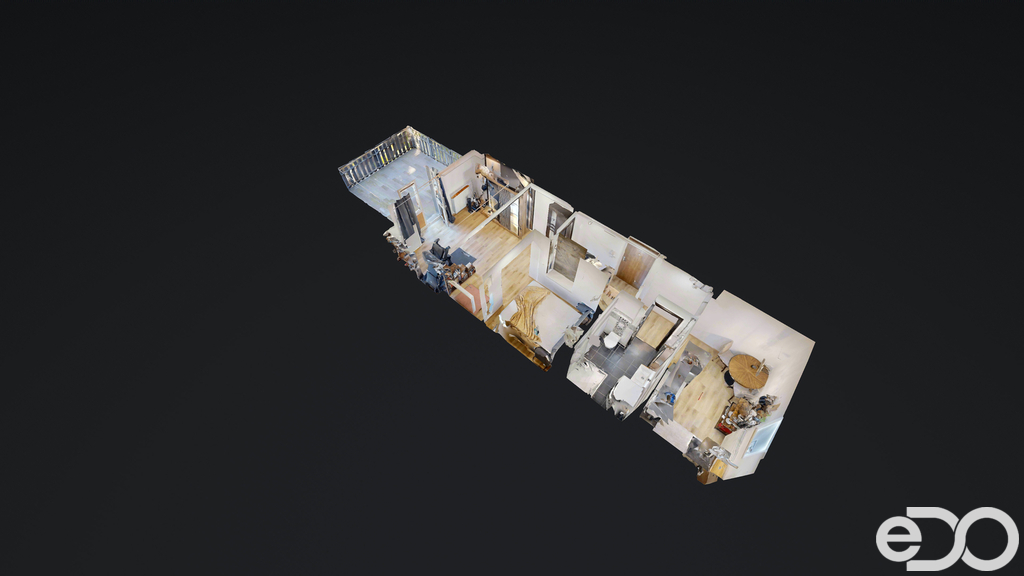 Při vstupu se dostanete do chodby. Do leva se jde do místnosti s kuchyňským koutem a dále tu jsou dveře do koupelny, vpravo od vstupu dojdete do velké napůl přepažené místnosti ( takže byt evokuje spíše rozdělení 3+kk ) z které je vstup na velkou terasu.
