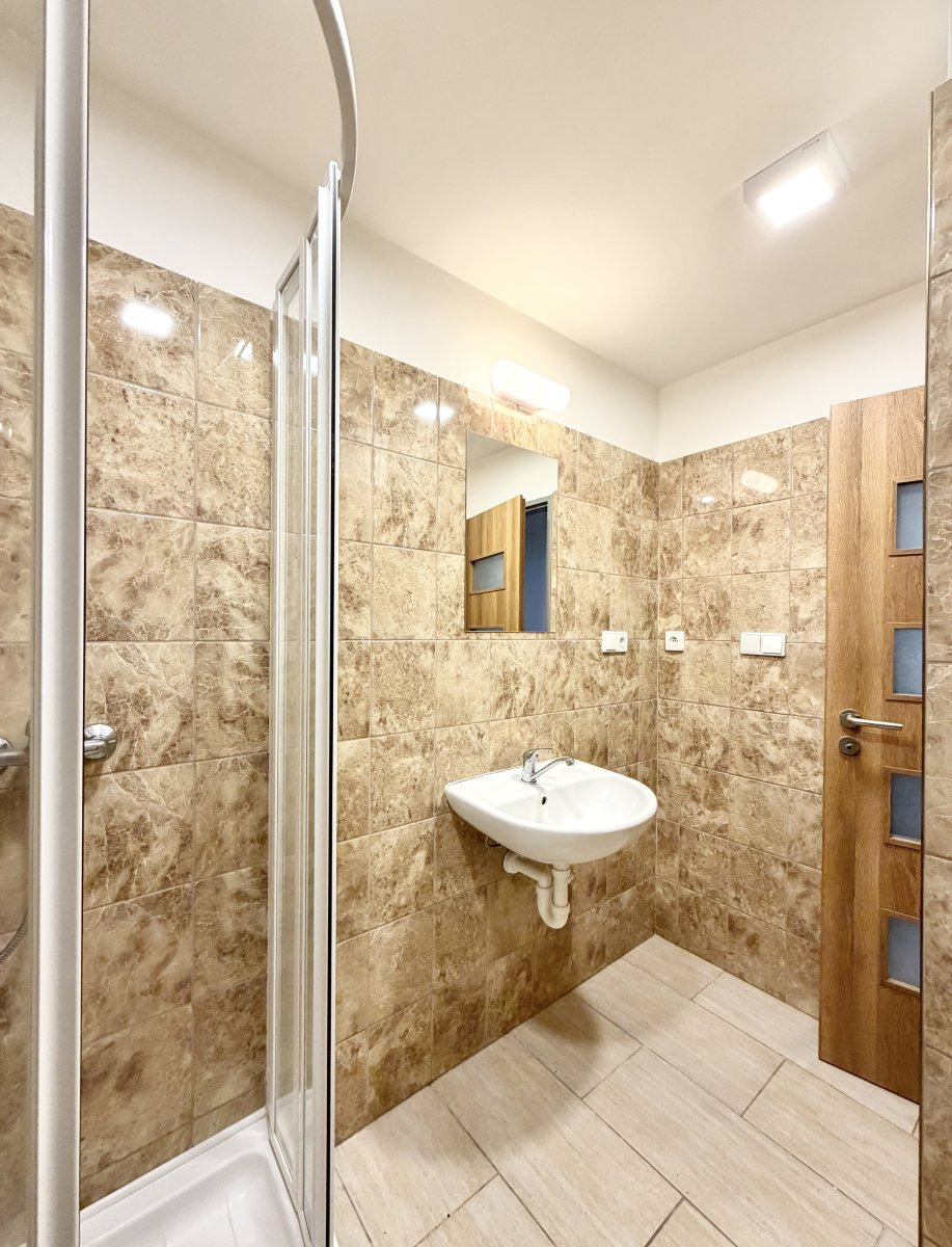 Byt se nabízí částečně vybavený. Kuchyně disponuje lednicí, elektrickým sporákem a digestoří. Obývací část je nezařízená. V sprchový kout, umyvadlo, toaleta a topný žebříček.
