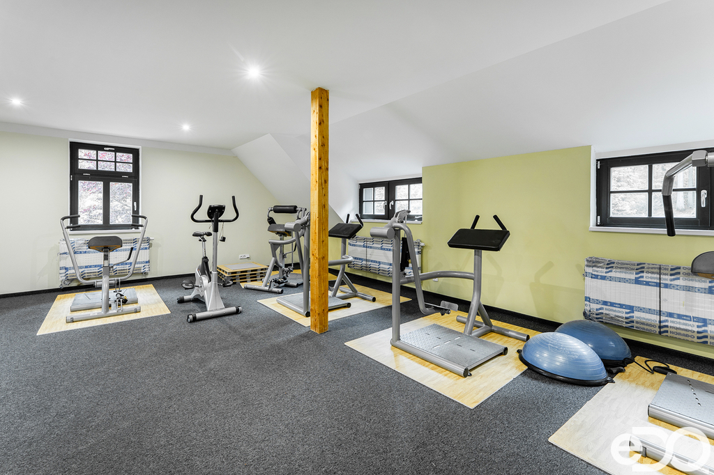 V podkroví: byt správce 2+kk, služební místnosti, posilovna 56 m²