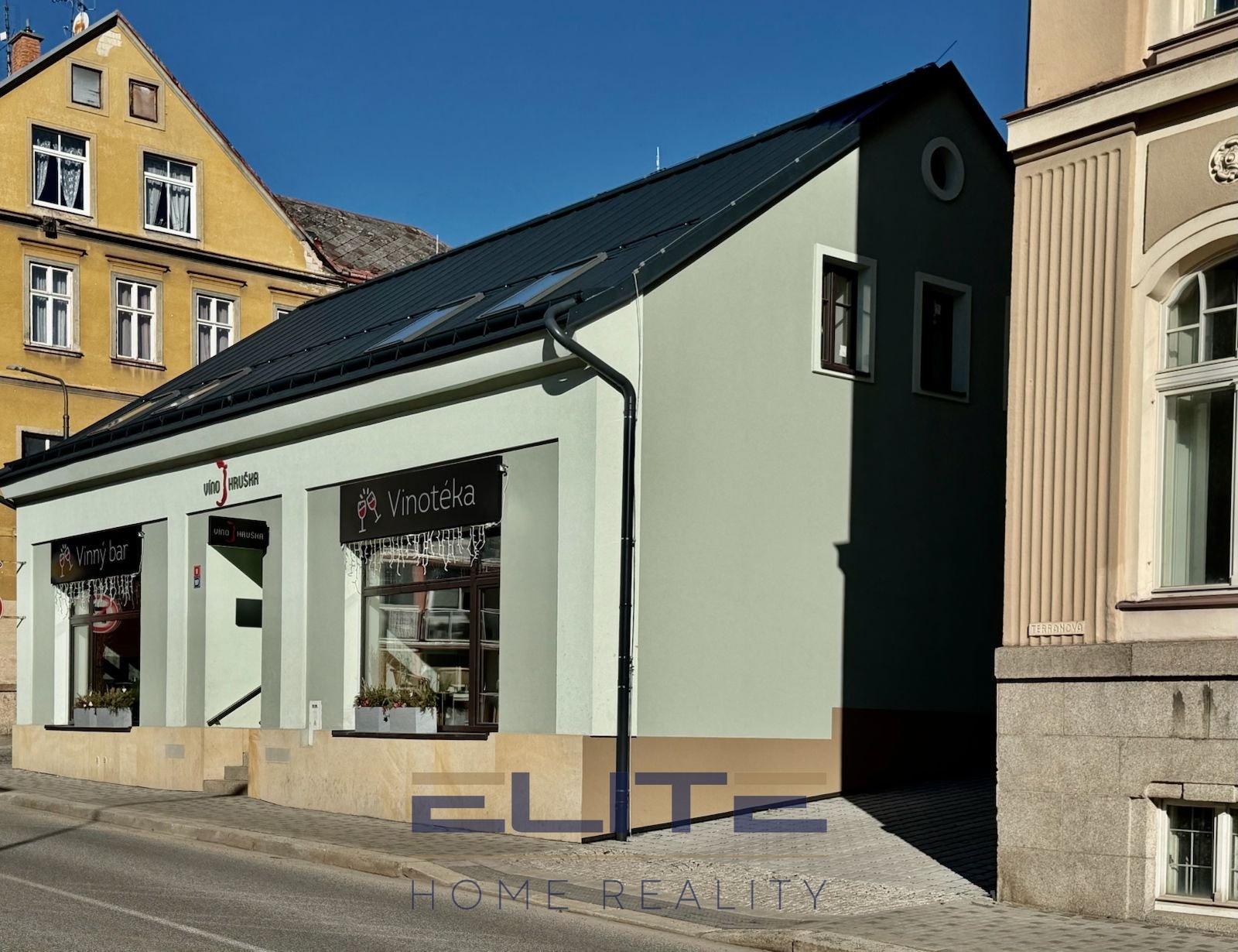 V přízemí domu se nachází designová, velmi příjemná a moderní vinotéka Víno Hruška, jejíž vytříbený styl se promítá i do interiéru samotného bytu. V patře jsou 2 byty zrcadlově proti sobě na pronájem.