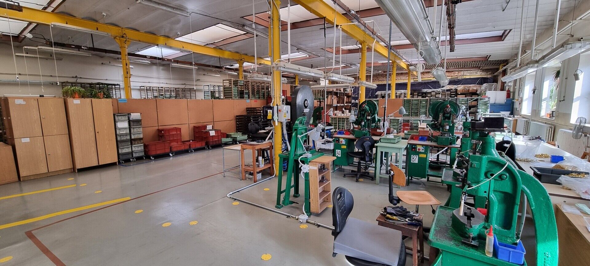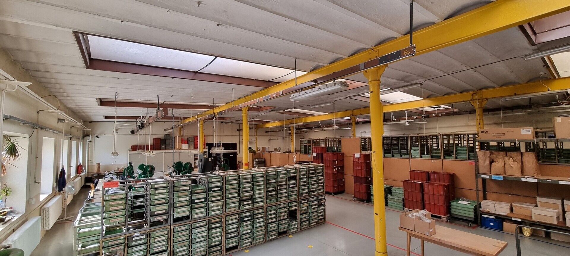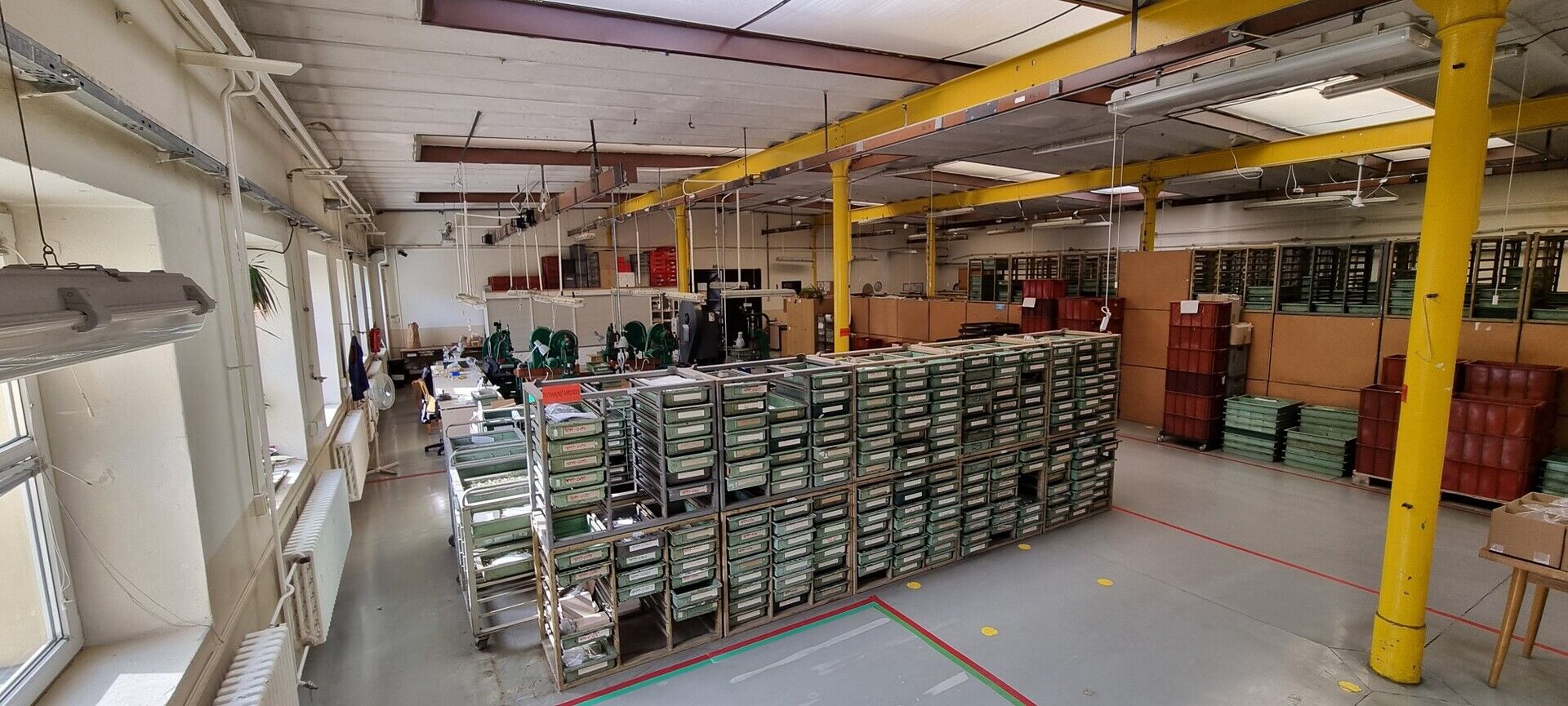 - 1. patro (1.300 m2): výrobní haly, sklady, svačinárna.
