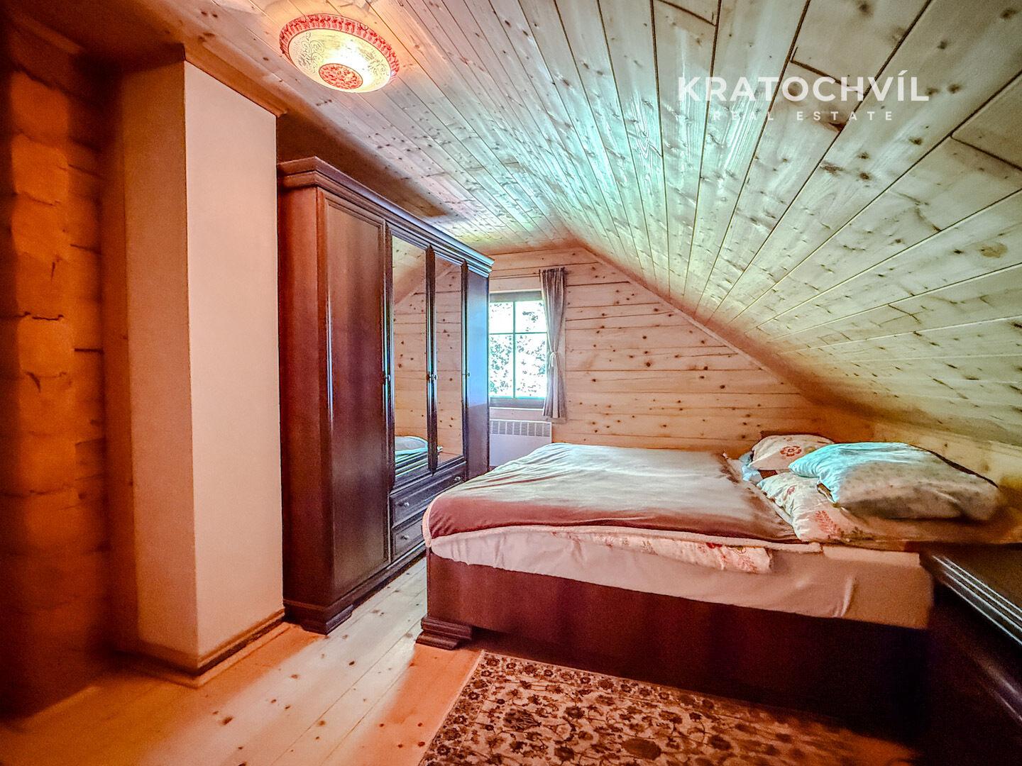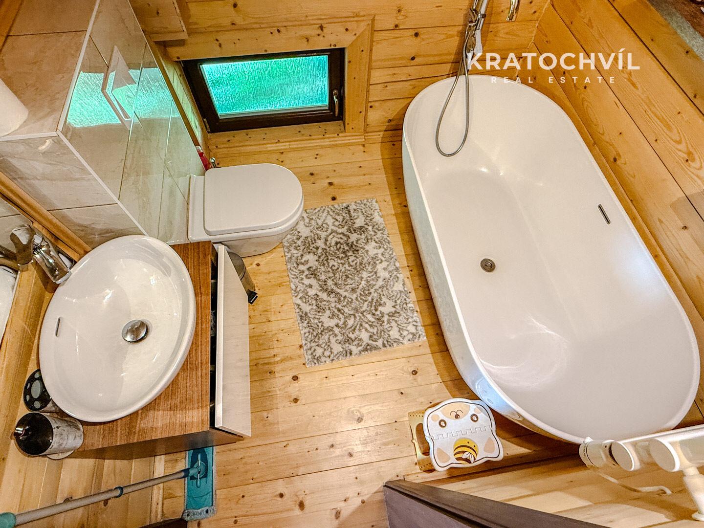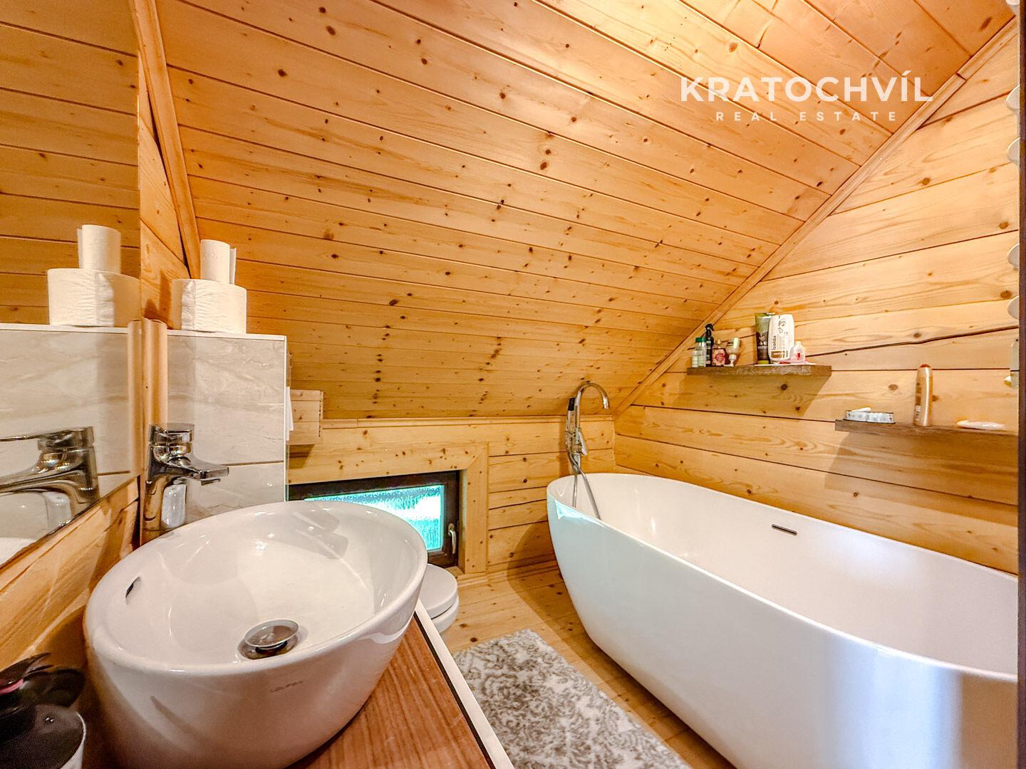 V patře jsou situovány tři samostatné pokoje a druhá koupelna vybavená vanou.