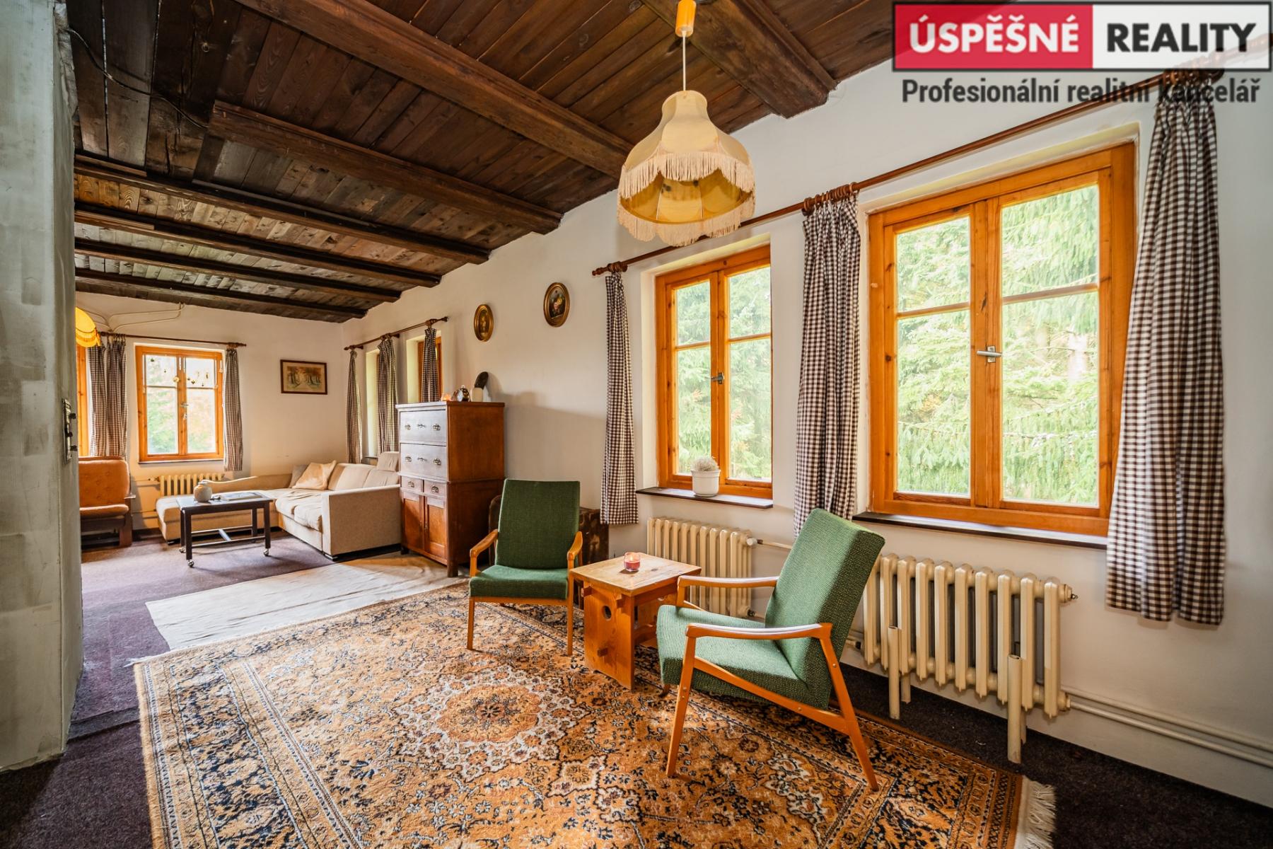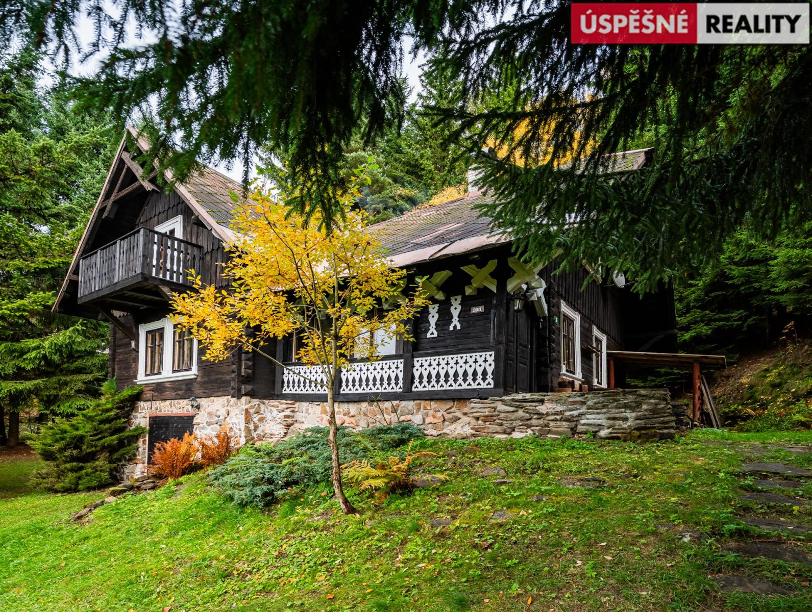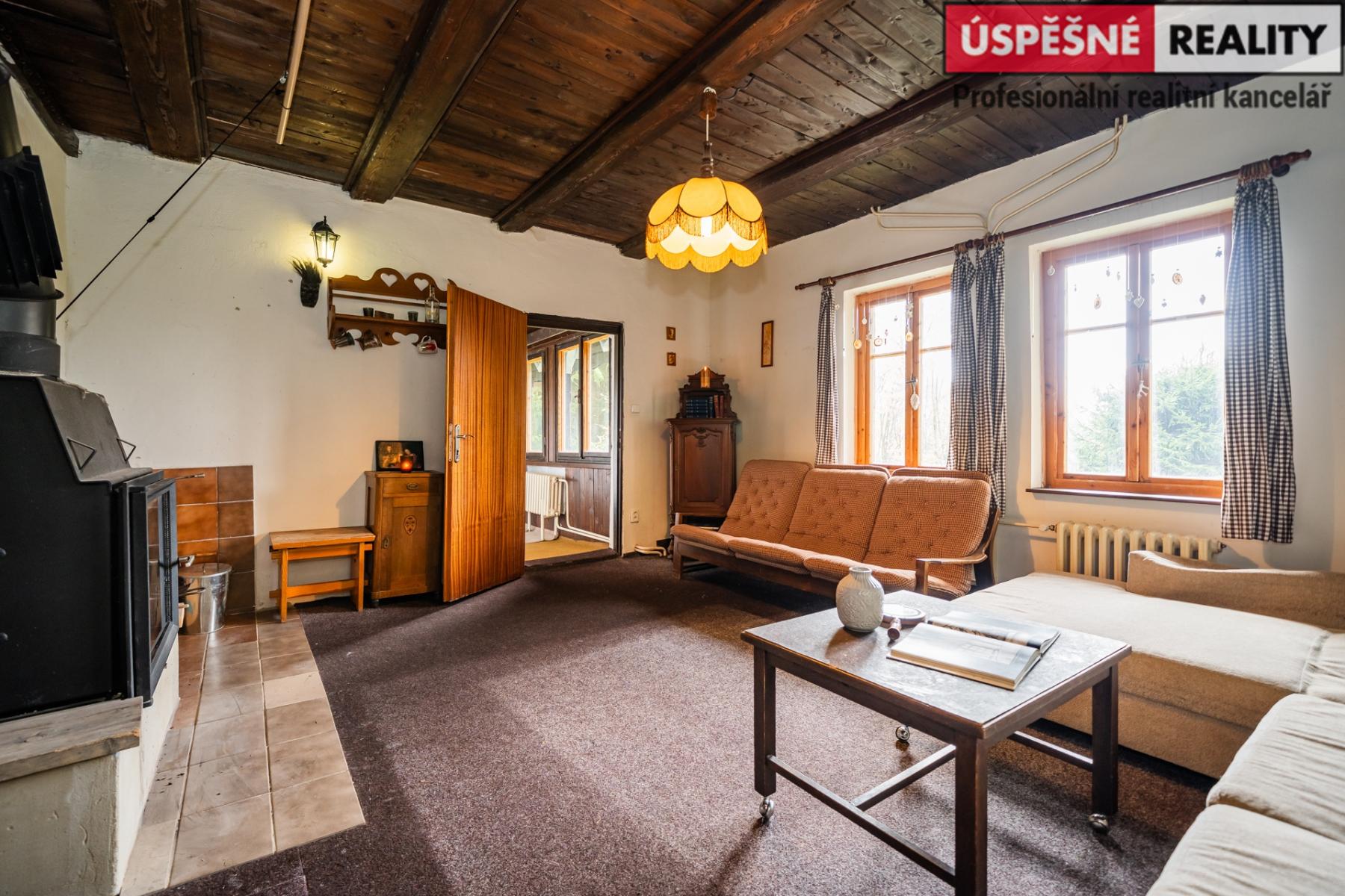 Hlavní komunikační prostor a srdce této nemovitosti tvoří velkoryse řešený obývací pokoj s krbovými kamny v přízemí, podkrovní část pak disponuje čtyřmi samostatnými ložnicemi. Vytápění objektu je zajištěno již zmíněnými krbovými kamny s výměníkem, v kombinaci s elektrokotlem na dálkové ovládání, voda je do něj přivedena z místního pramenu. Odpady jsou svedeny do septiku. Chata je situovaná na polosamotě a obklopená lesy a přírodou. Jednu z hranic pozemku lemuje malý potůček.