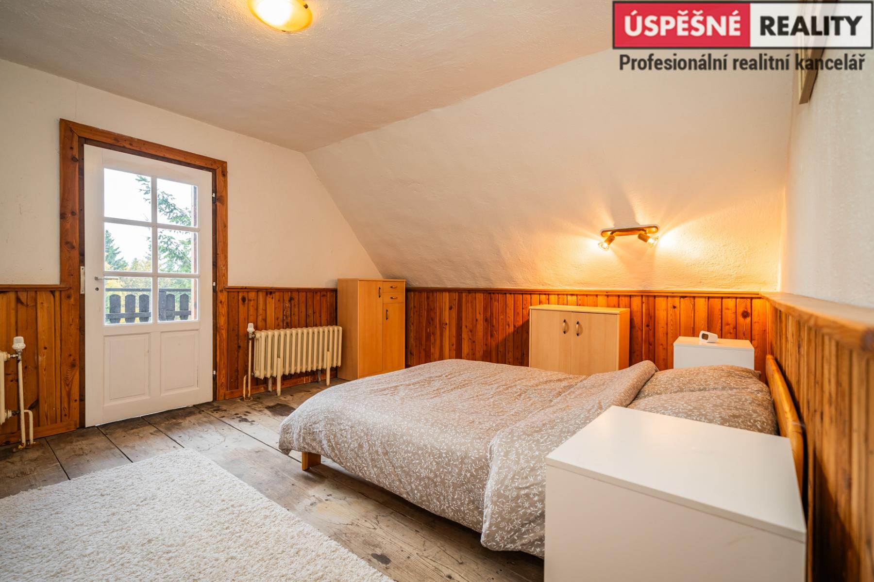 Dřevěná chata s kamennou podezdívkou o dispozici 5+1, stojí na jižním svahu nejvyšší hory Krušných hor Klínovci, nad klidnou obci Suchá u Jáchymova. Dispozice: 1.NP: Zasazen do svahu garáž nyní využívána jako dílna, technická místnost, kotelna 2.NP Vstupní veranda, chodba, obývací pokoj, kuchyň s jídelnou, spíž, WC a koupelna. 3.NP 4x ložnice. 4.NP Půda, z části zateplená.