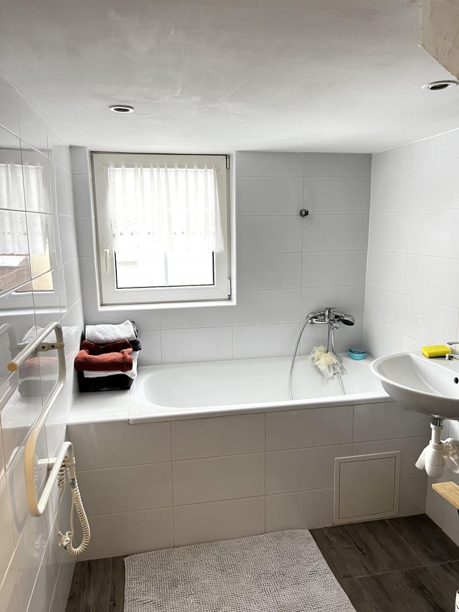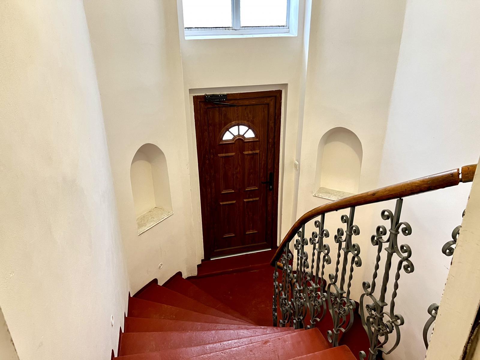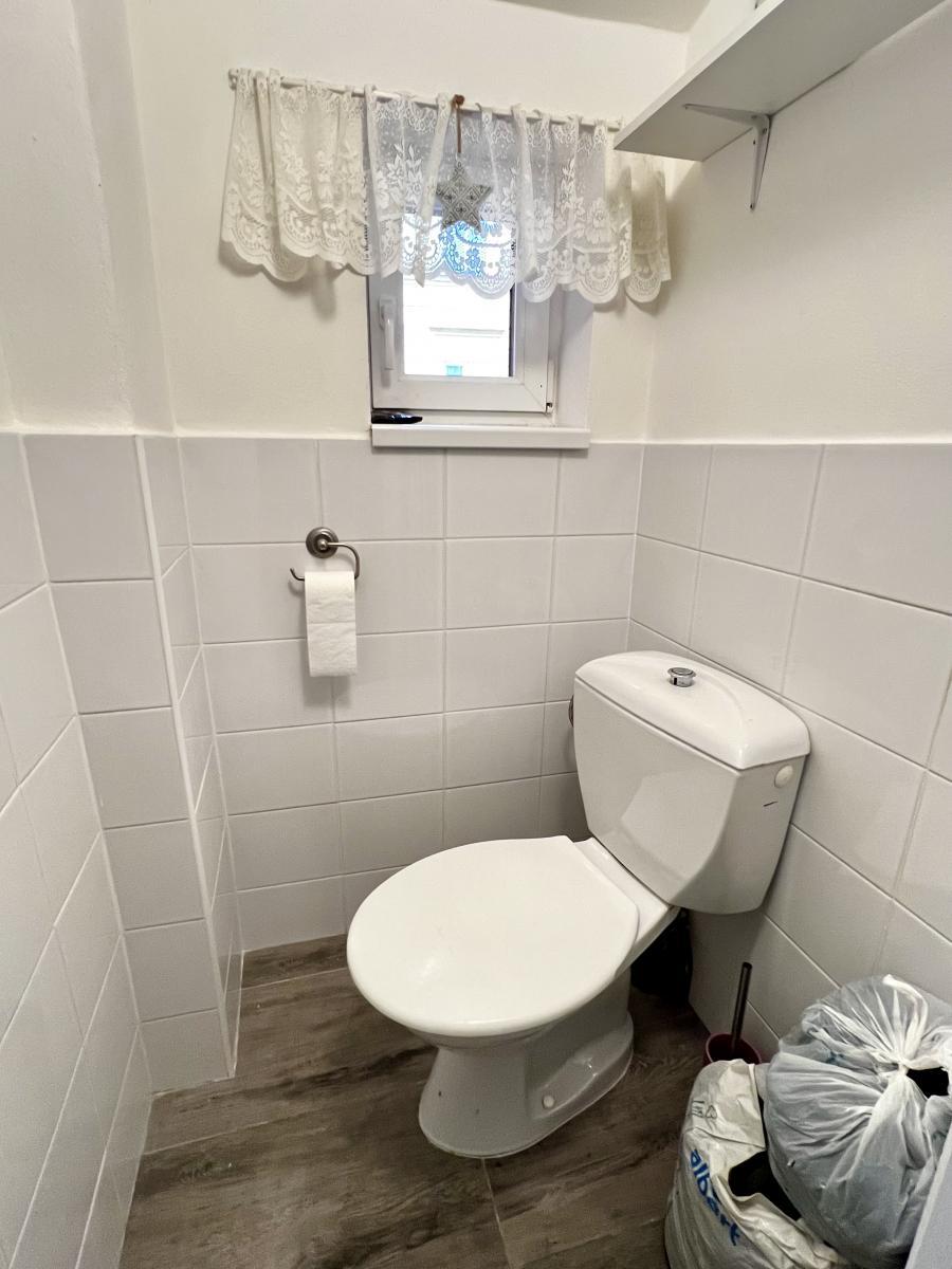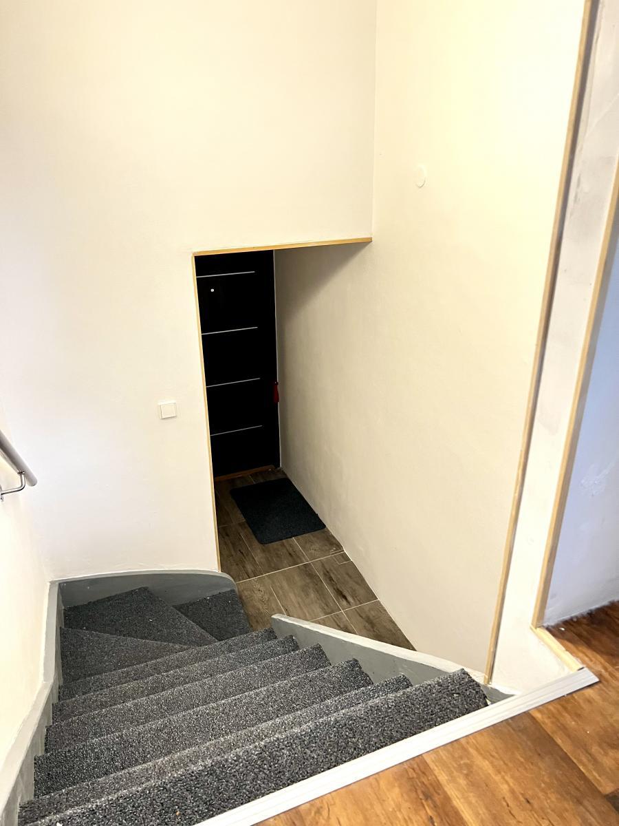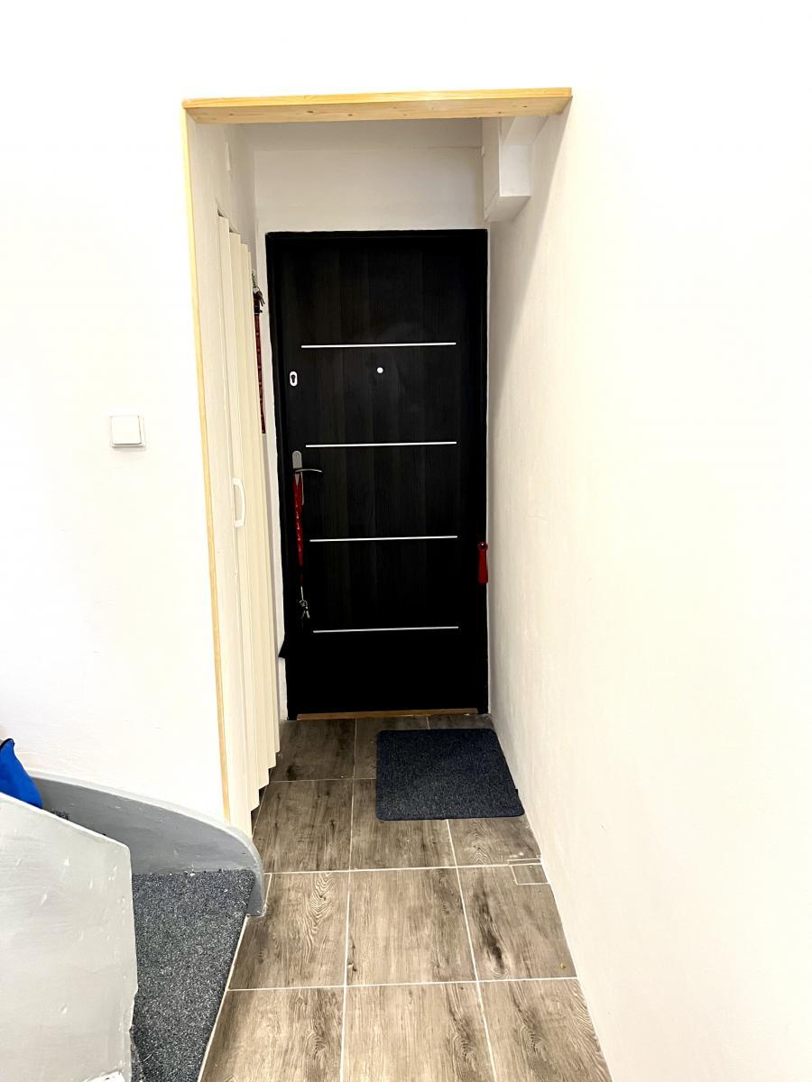 Dispozice bytu je řešena ve dvou úrovních v přízemní části se nachází vstupní chodba, samostatné WC a koupelna s vanou a oknem.