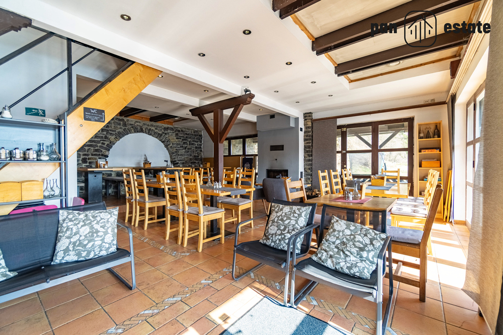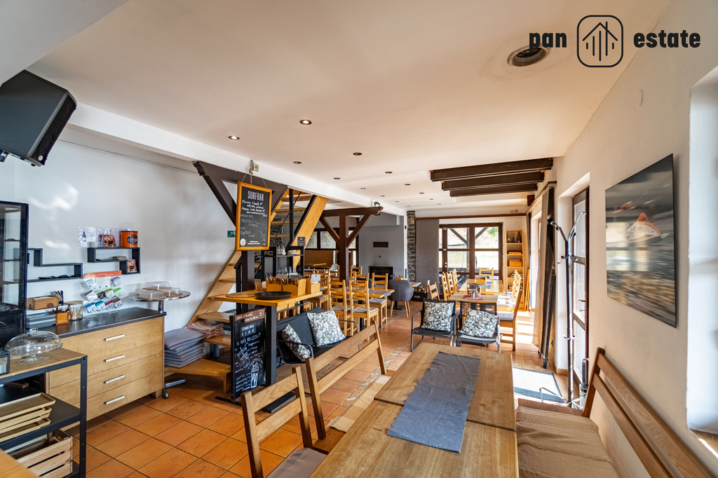 Samotná restaurace nabízí v přízemí cca 130 m² a je připravena k provozu bez nutnosti dalších zásadních investic. K dispozici je hlavní stylová restaurace s posezením a krbem, kompletně vybavená kuchyně, sociální zázemí, sklady a další potřebné provozní prostory. Velkou přidanou hodnotou je také venkovní zahrádka v atraktivním prostředí u vody, která přímo vybízí k letnímu provozu, rodinným posezením, oslavám, grilování i soukromým akcím.