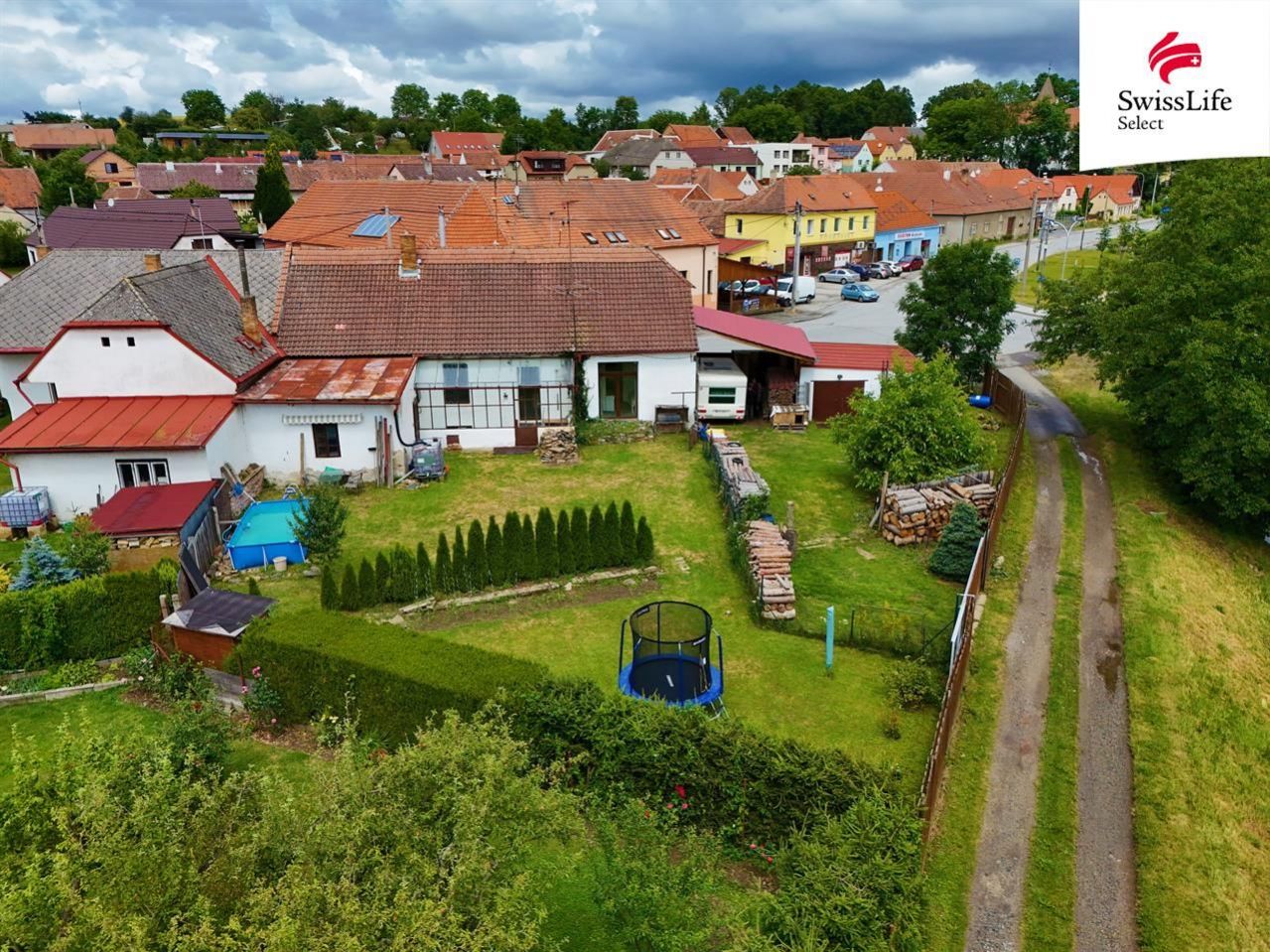 K domu patří zázemí v podobě garáže a dalšího krytého garážového stání, kam se vejde i obytný přívěs za auto.