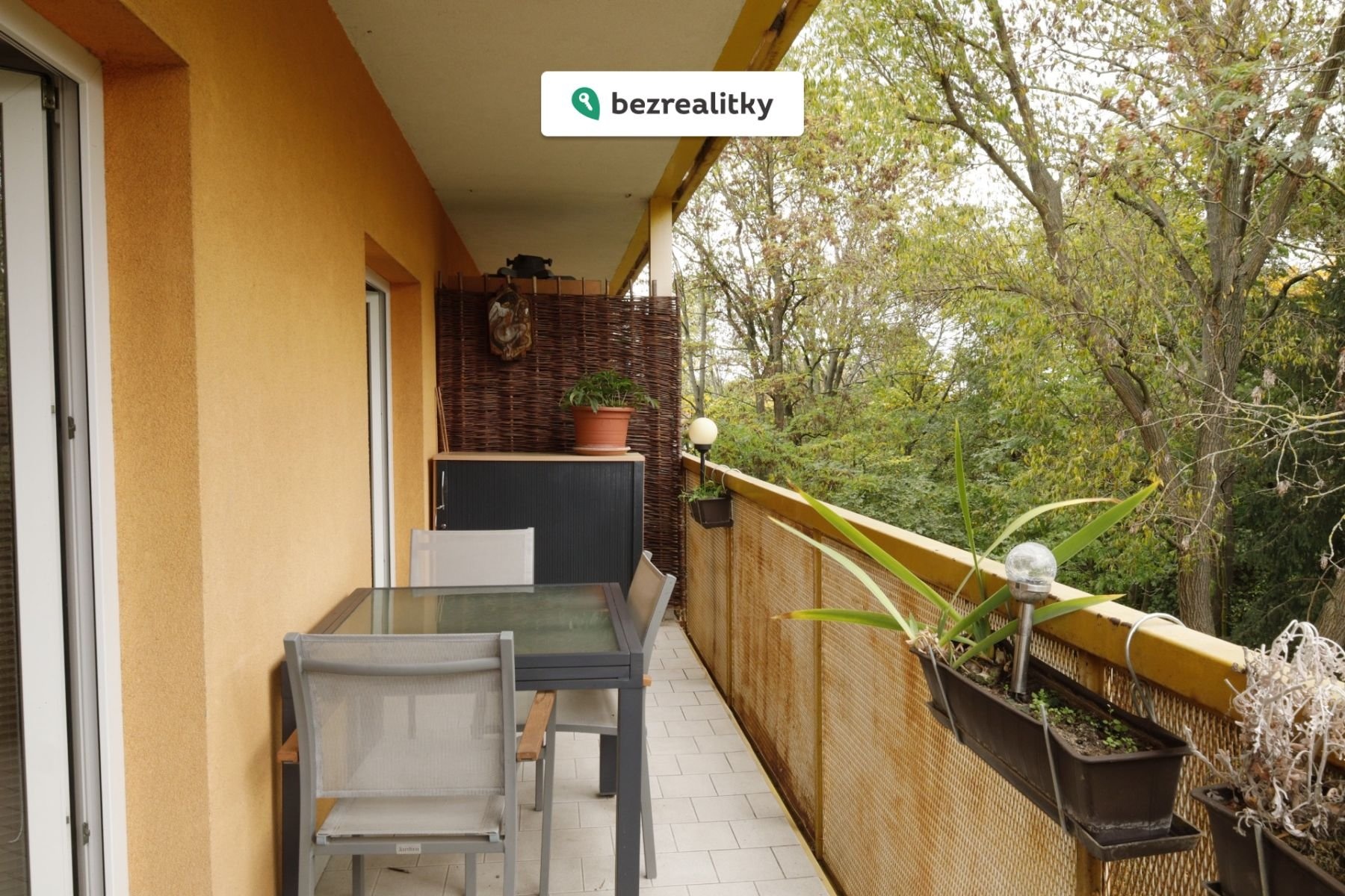✔ Prostorný balkon 10 m² s výhledem do zeleně a na vzrostlé stromy.