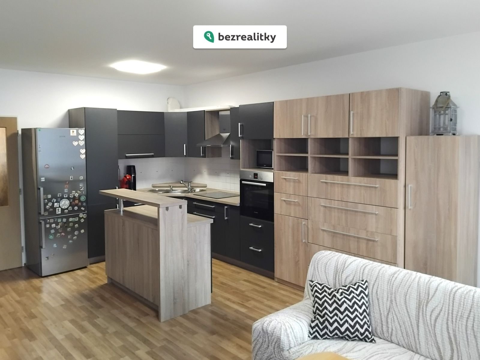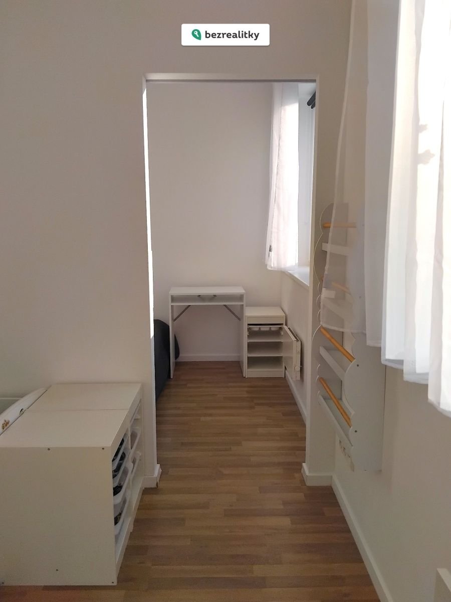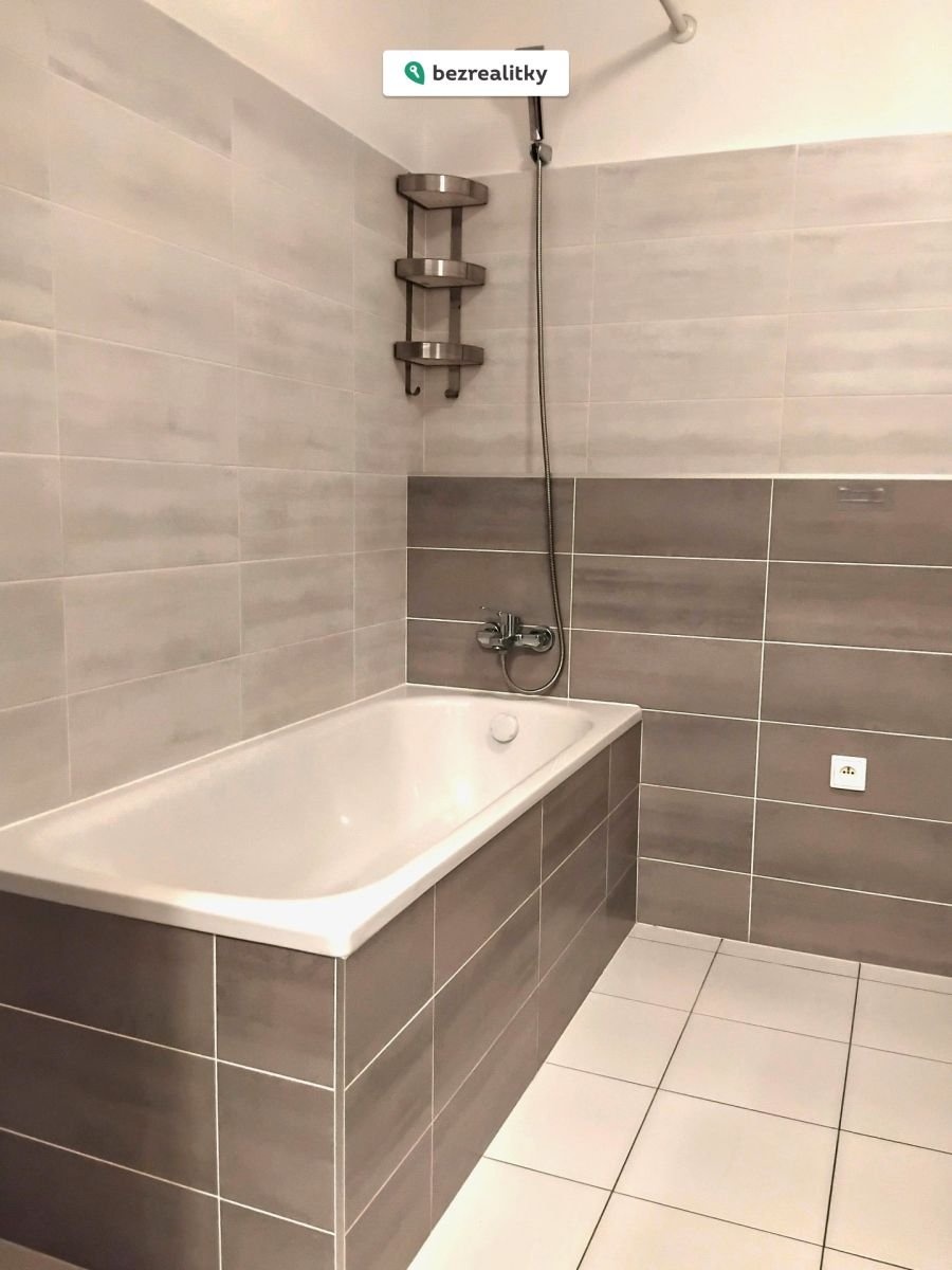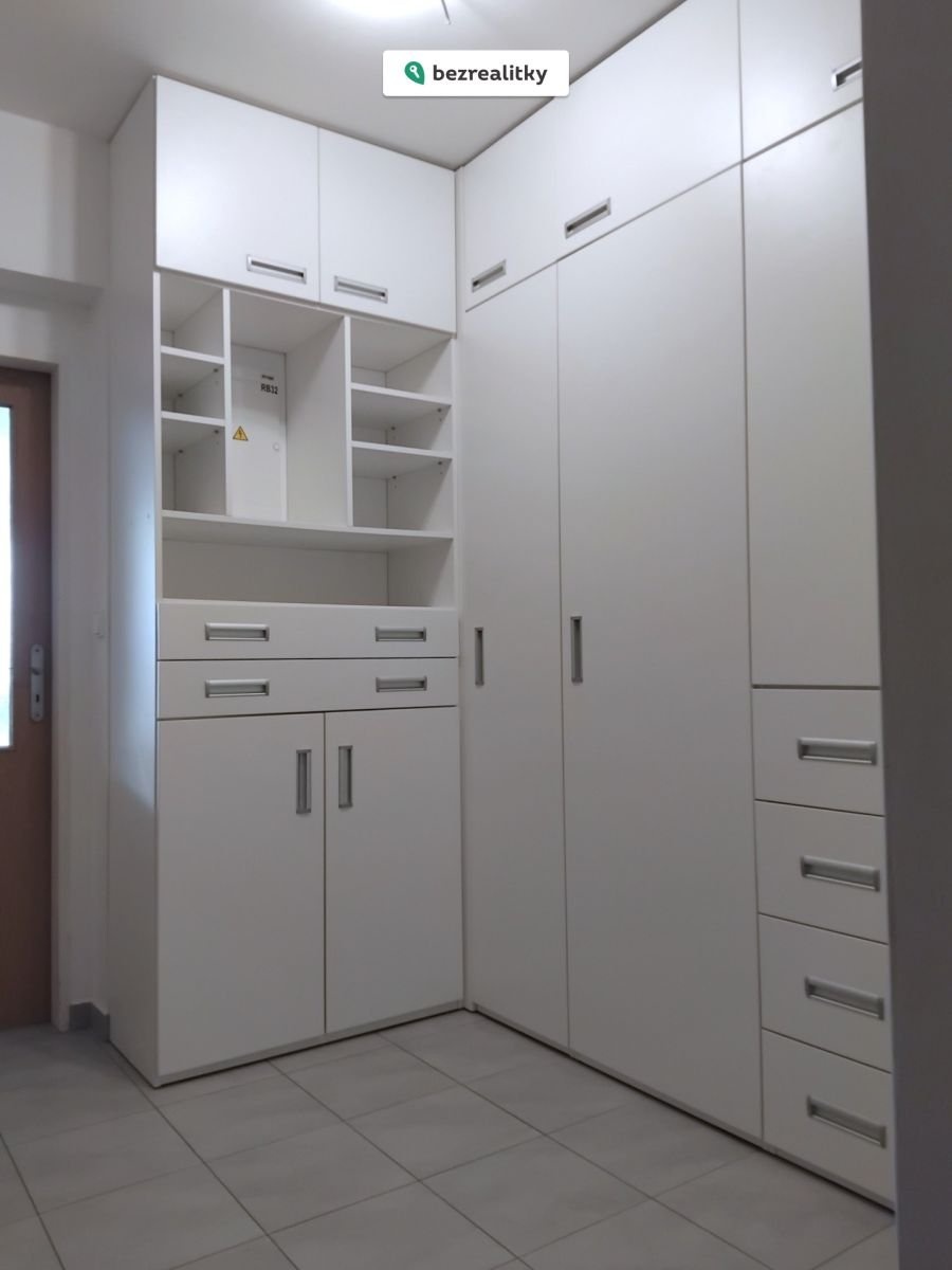 Kuchyňská linka je vyrobena na míru a zahrnuje vestavěné spotřebiče a praktický kuchyňský ostrůvek. Prostorná koupelna je vybavena vanou, závěsným WC a umyvadlem se skříňkou; obklady jsou v moderním šedém provedení. Úložný prostor zajišťuje velká vestavěná skříň v chodbě. Ložnice (16,7 m²) je majitelem rozdělena sádrokartonovou příčkou na ložnici a dětský pokoj — příčku lze snadno odstranit a prostor vrátit do původního stavu.
