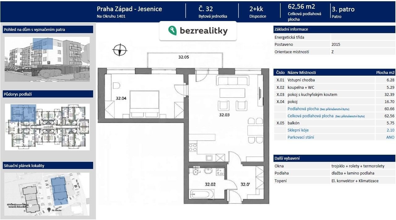 Byt o dispozici 2+kk se nachází ve 3. patře cihlového domu bez výtahu a je orientován na západ. Celková podlahová plocha činí 62,7 m² + balkón (5 m²) + sklepní kóje v přízemí domu (2,1 m²). Součástí prodeje je vlastní venkovní parkovací stání.