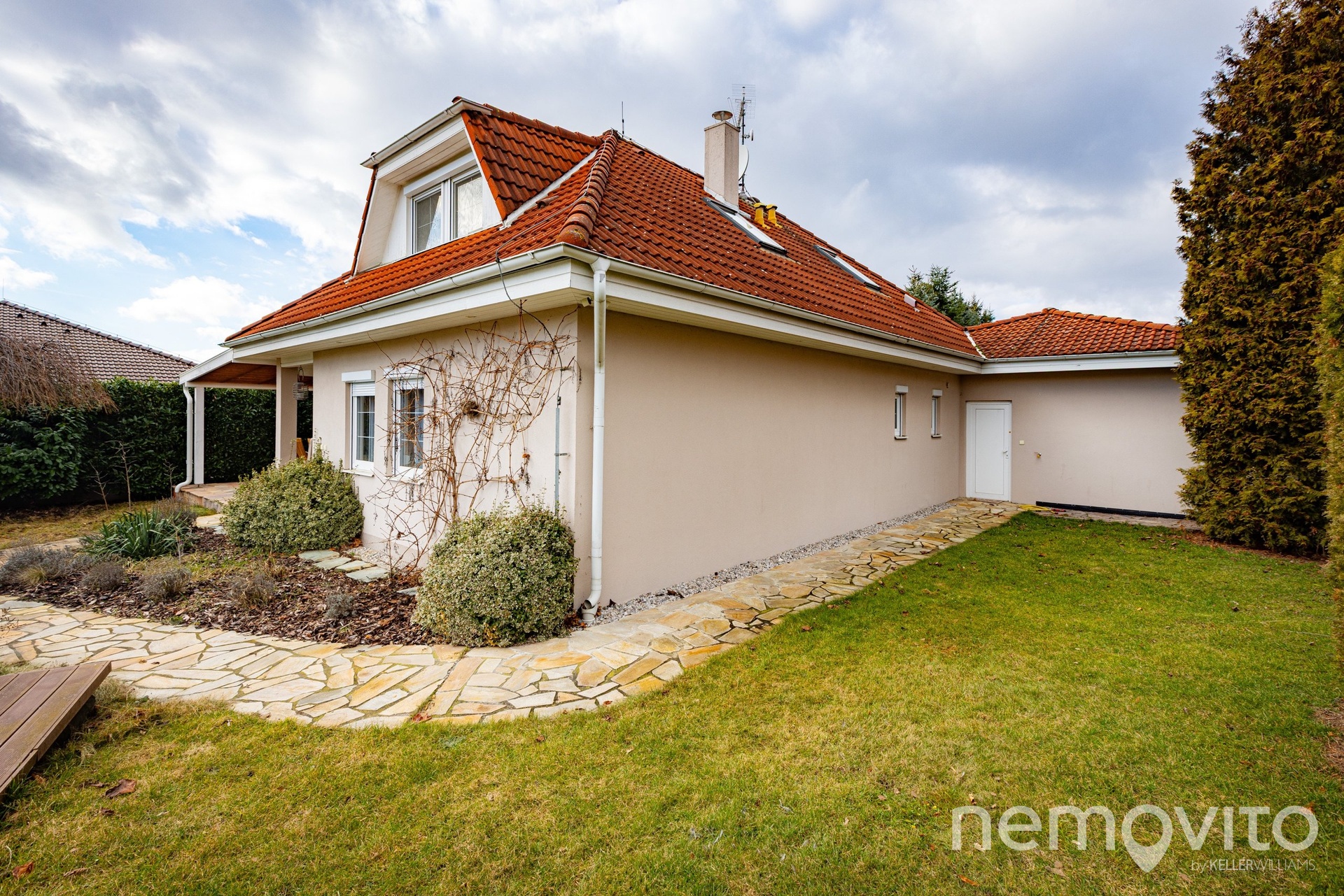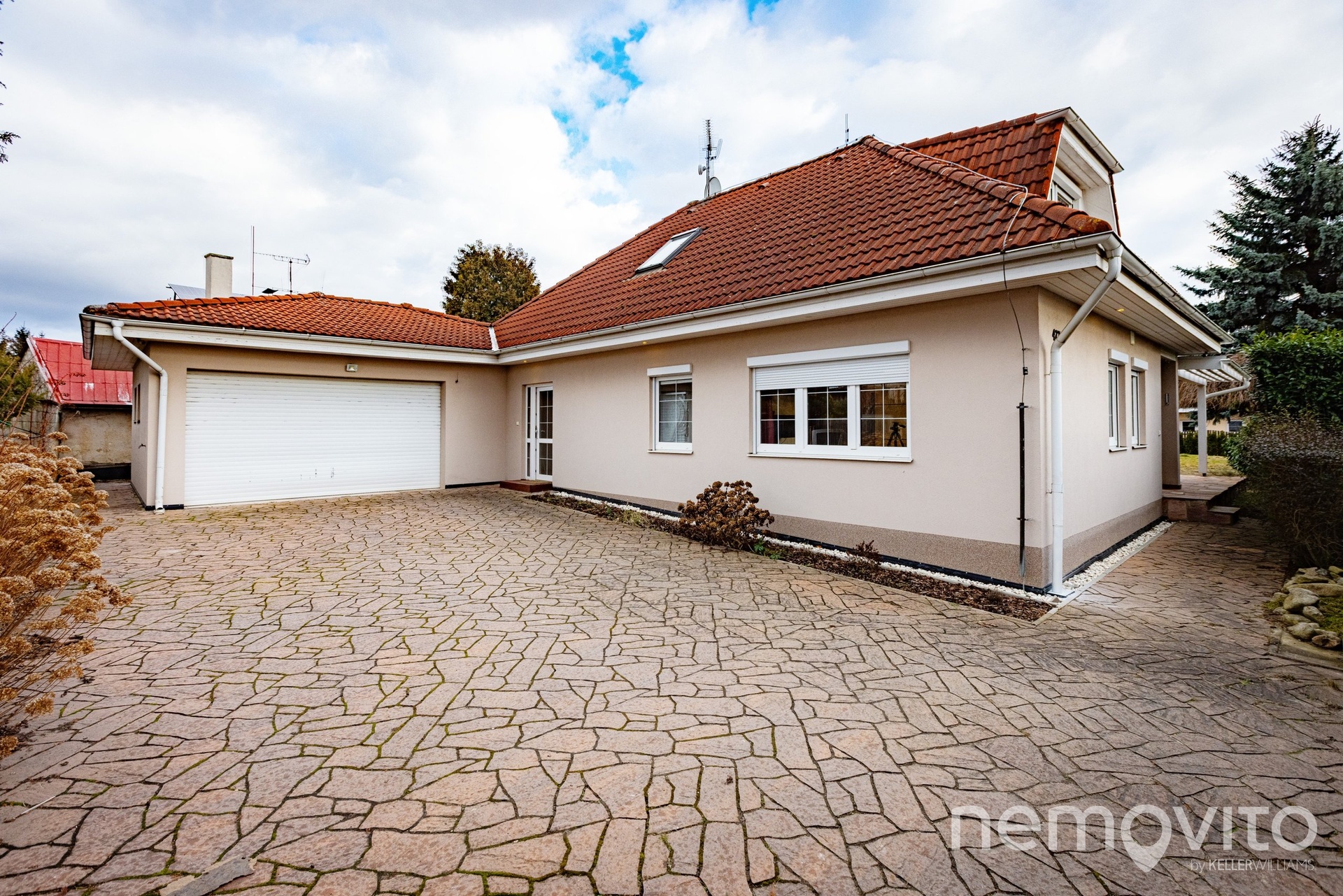 Garáž je zděná (s půdou) a s technickým zázemím má dohromady 39 m2. Dveře jsou i ze zahrady. Vstup je do zádveří, až poté do prostorné chodby se schodištěm, odkud je také vstup do prádelny s vanou. Nahoře byly původně 3 ložnice, nyní jsou dva menší pokoje spojené do jednoho. Nechybí zde velká koupelna (14 m2), oddělené WC i šatna (6 m2). Parkování je možné také na velké zpevněné ploše před garáží.