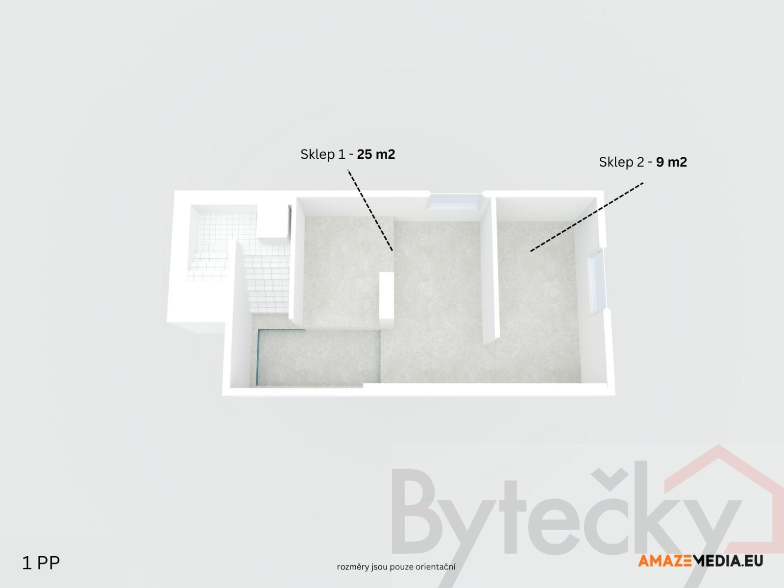 1PP (suterén): sklep, kotelna 34 m
