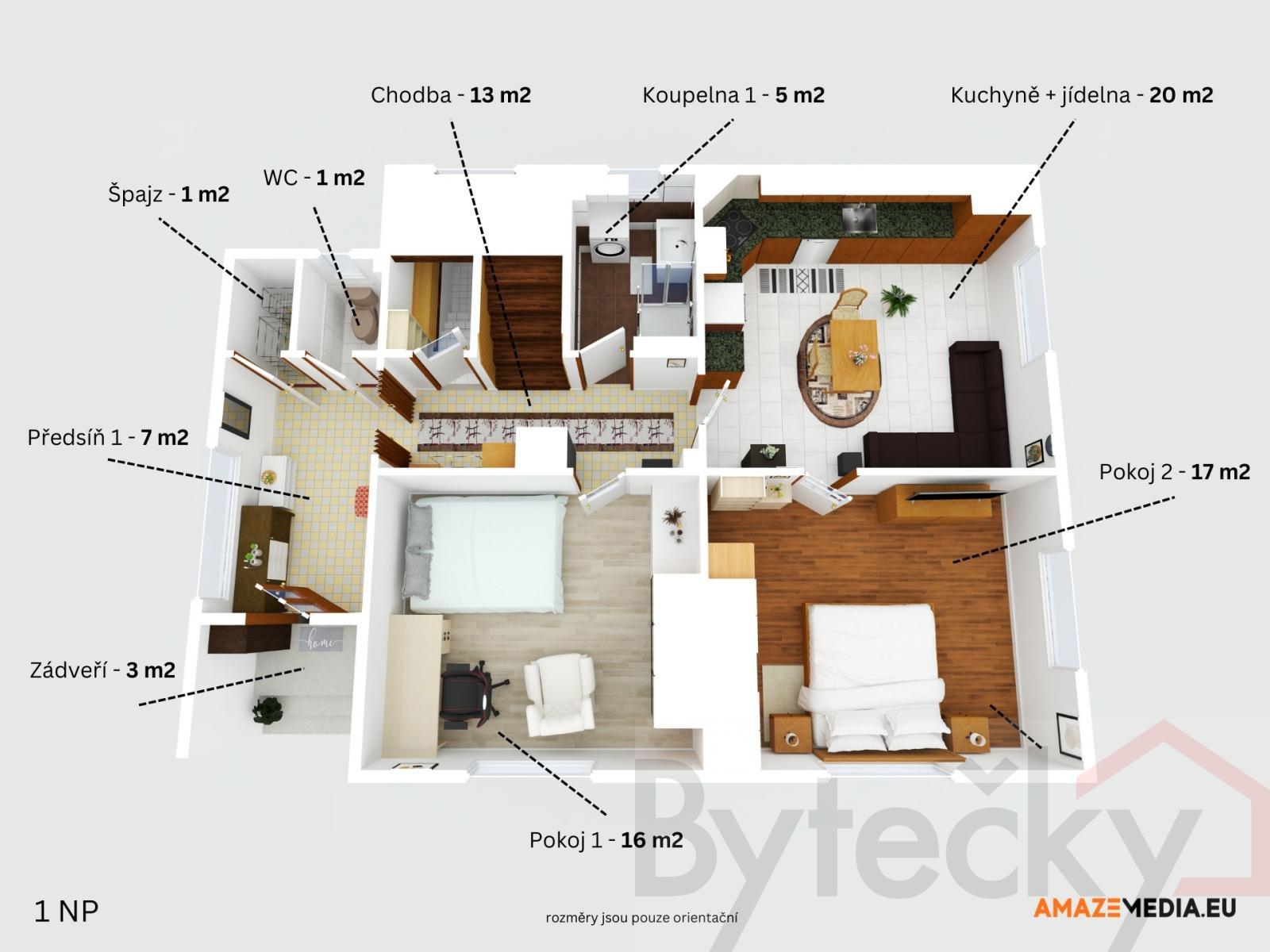 1NP (přízemí): kuchyň, 2 pokoje, chodba, koupelna se sprchovým koutem, WC, špajz, zádveří, schodiště do sklepa i patra 80 m