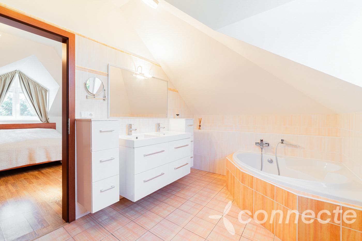Velkým benefitem je také praktické dispoziční řešení domu. Jedna z ložnic disponuje vlastní koupelnou, další ložnice pak vlastní šatnou. Díky čtyřem koupelnám získá každý člen rodiny nadstandardní míru pohodlí a soukromí. V případě potřeby lze navíc nemovitost velmi dobře využít i pro dvougenerační bydlení.
