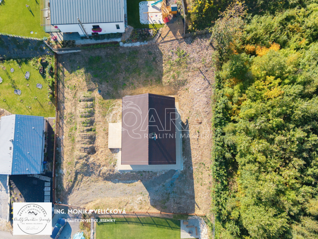 Pozemek má výměru 1 111 m², z toho zastavěná plocha a nádvoří 114 m². Dům je situován při okraji parcely, aby zahrada nabídla dostatek prostoru a terasa poskytla otevřený výhled na Jeseníky. Pro zájemce je navíc k dispozici zpracovaný projekt zahrady, který může sloužit jako inspirace nebo okamžitý podklad pro realizaci venkovního prostoru. Významným bonusem je také možnost využití půdy, která je pochozí a umožňuje vybudování další obytné místnosti.