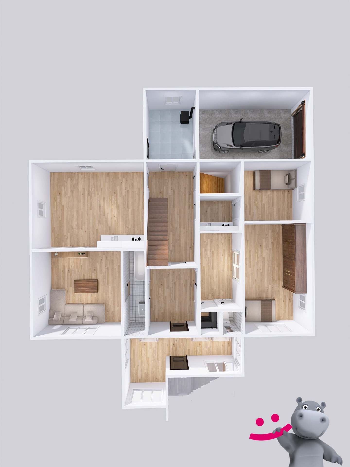 • 1.NP: vstup do domu - veranda, chodba, 3 samostatné obytné části, průchod na zahradu přes kotelnu, garáž, vstup do sklepa, do patra