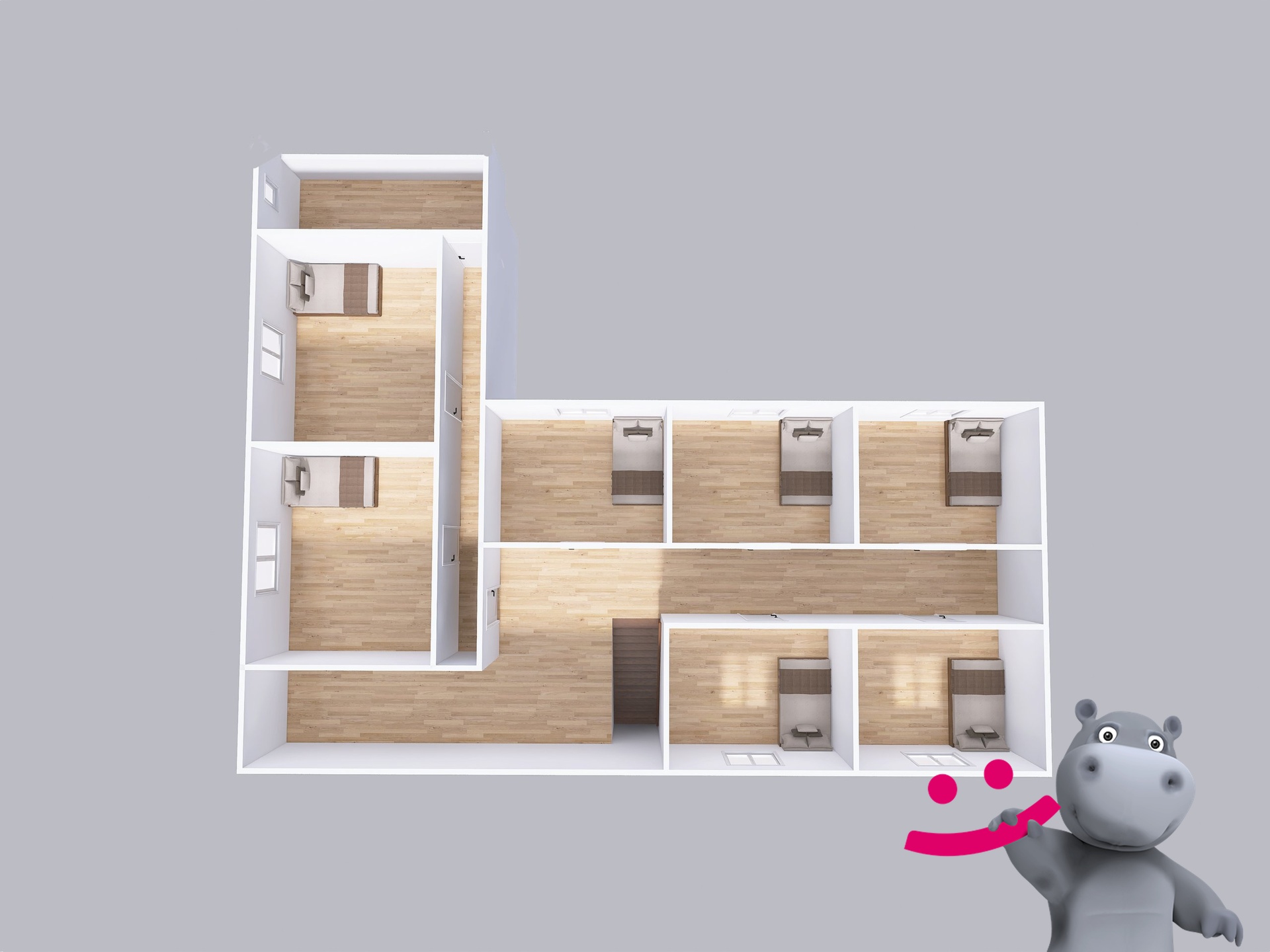 Patro je rozděleno na pravou část, kde se jde z chodby do 4 samostatných pokojů, proti vstupu na patro je jeden pokoj a v levé části další 2 pokoje.