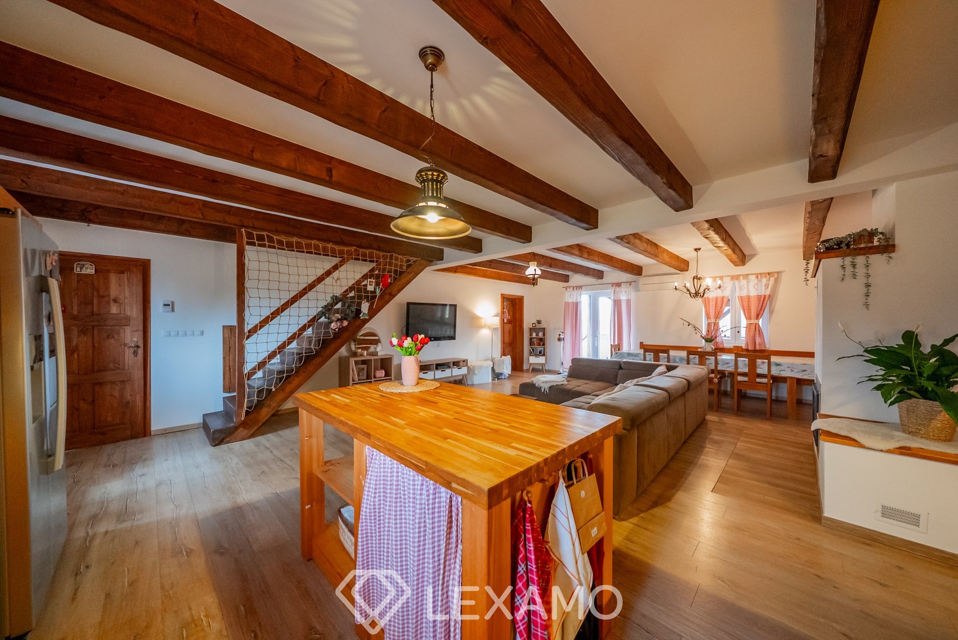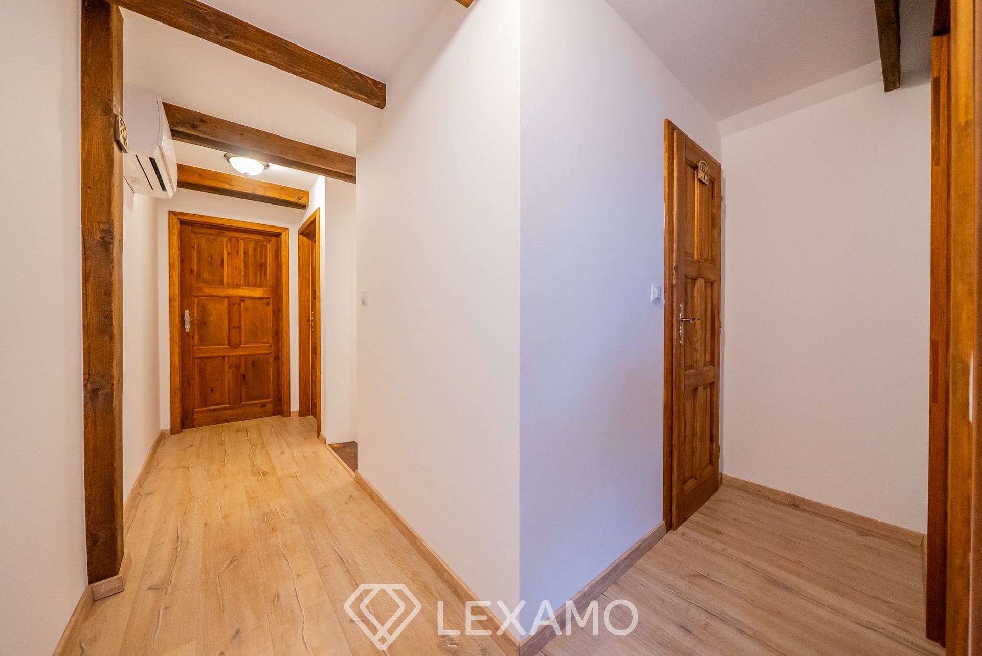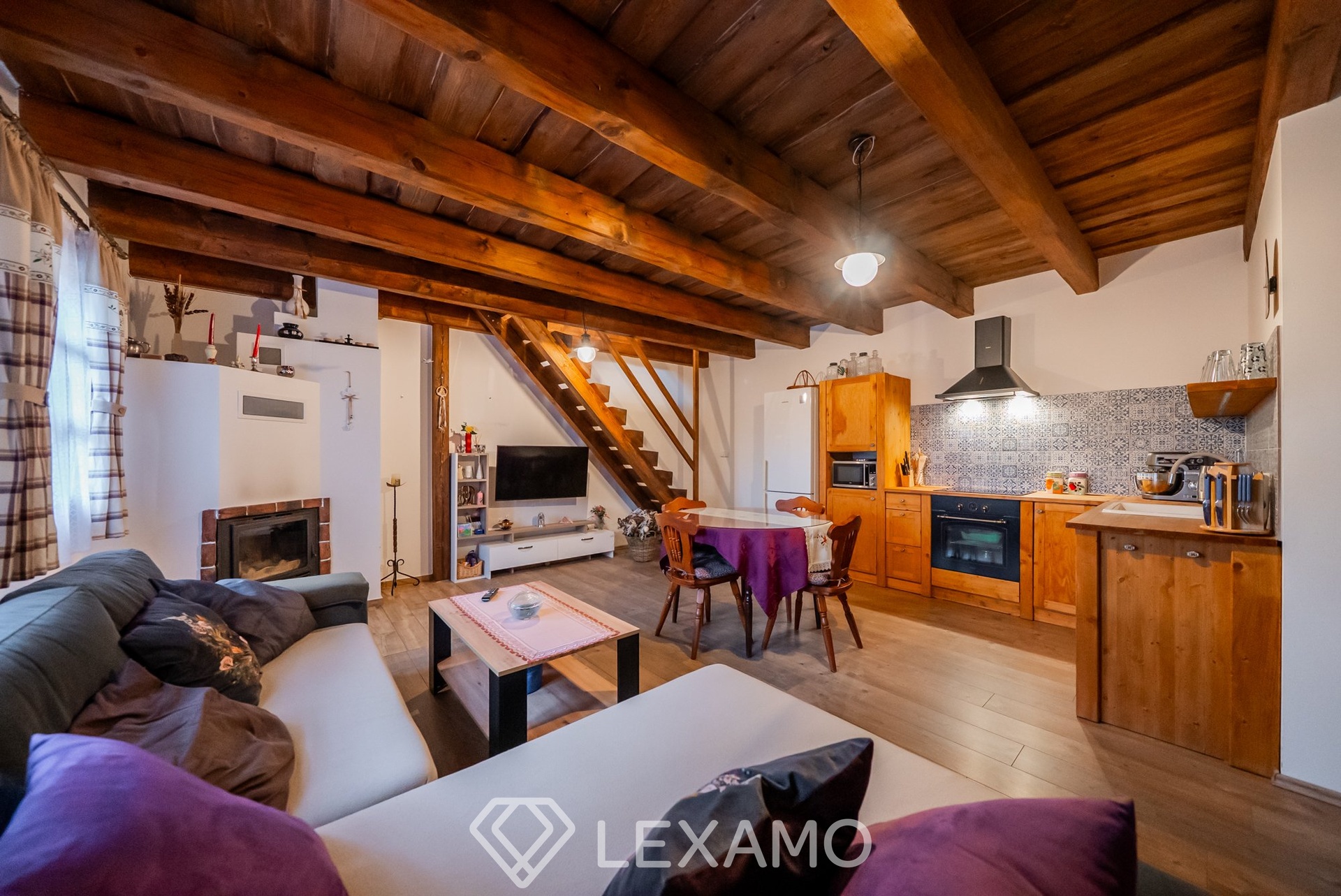 Interiér domu působí velmi příjemně a útulně díky přiznaným dřevěným trámům, které dodávají prostoru charakter a jedinečnou atmosféru. Technické řešení domu nabízí vysokou flexibilitu – vytápění lze řešit dvěma krby, přičemž je připravena instalace tepelného čerpadla nebo kotle na dřevoplyn či pelety. Samozřejmostí je klimatizace ve všech podlažích i v samostatném objektu. Provoz domu je dlouhodobě ověřen jako ekonomicky úsporný.