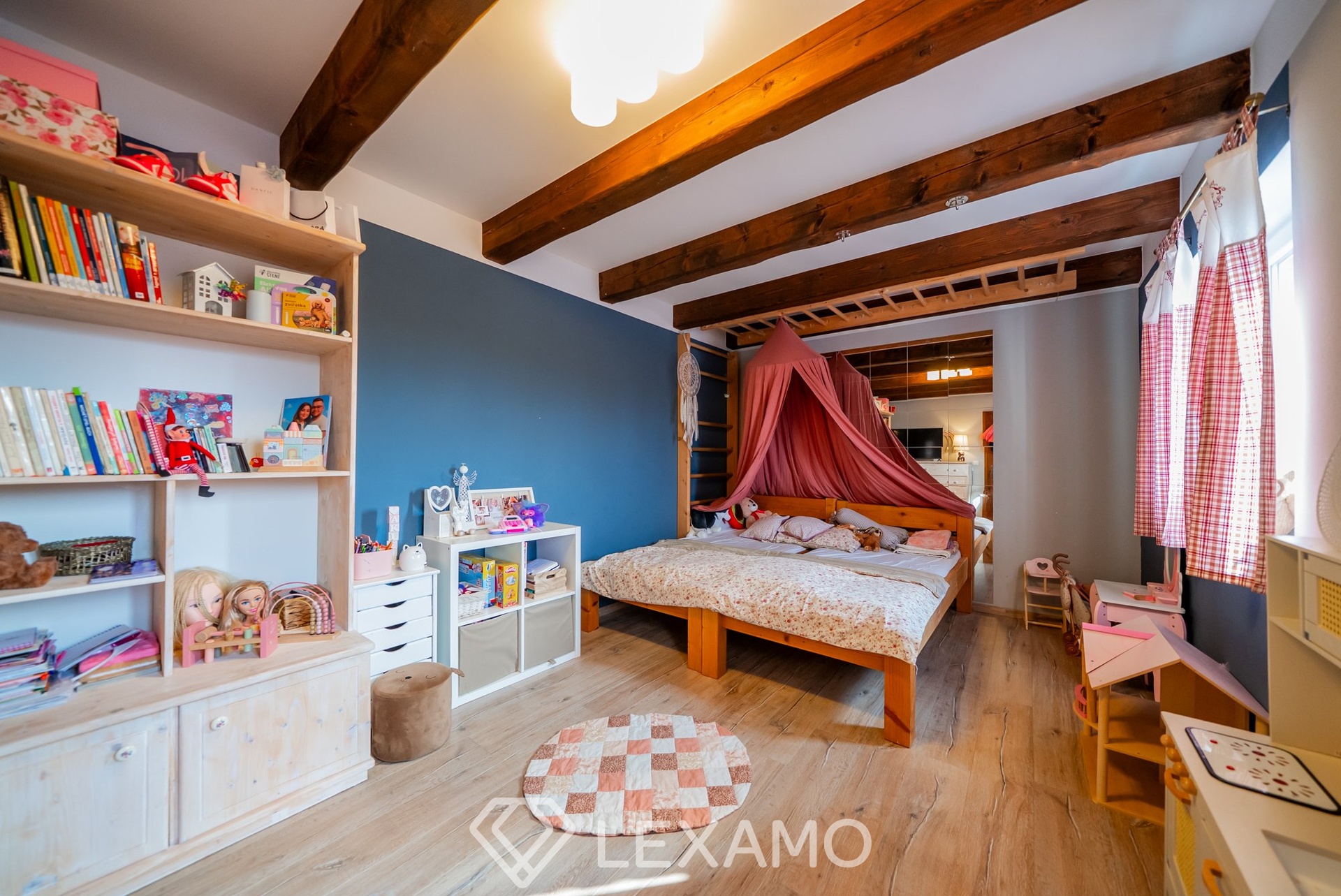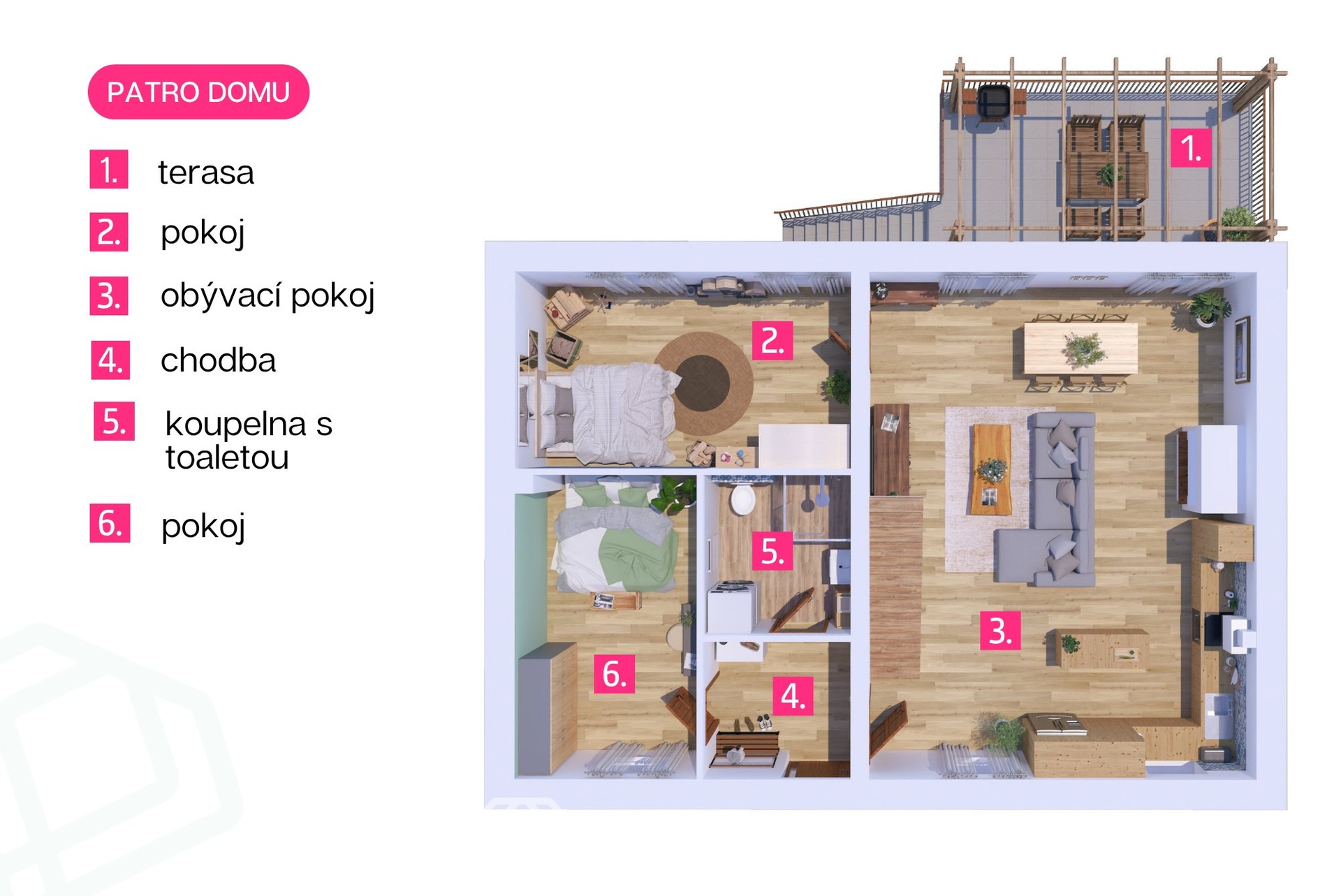 V horním podlaží jsou situovány další tři samostatné pokoje o velkorysých výměrách (cca 19–26 m²), které poskytují dostatek prostoru pro rodinu i ubytování více osob. Nechybí zde ani další koupelna a komunikační prostor.