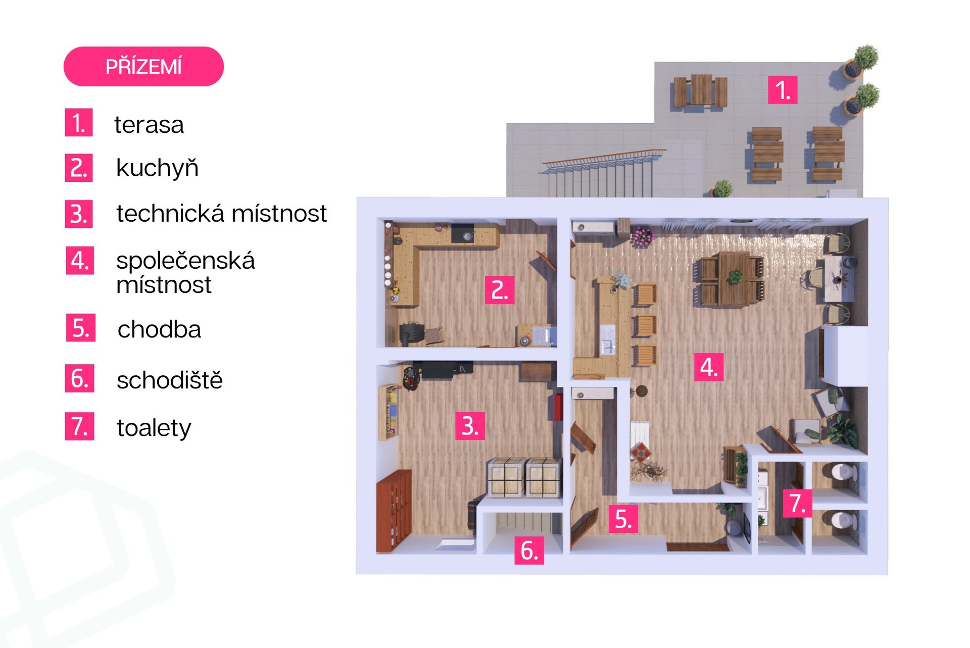 V přízemní části domu se nachází technické zázemí – technická místnost, přípravna a další prostory využitelné například pro skladování nebo hobby zázemí. Součástí je také krytá terasa a navazující venkovní prostor.