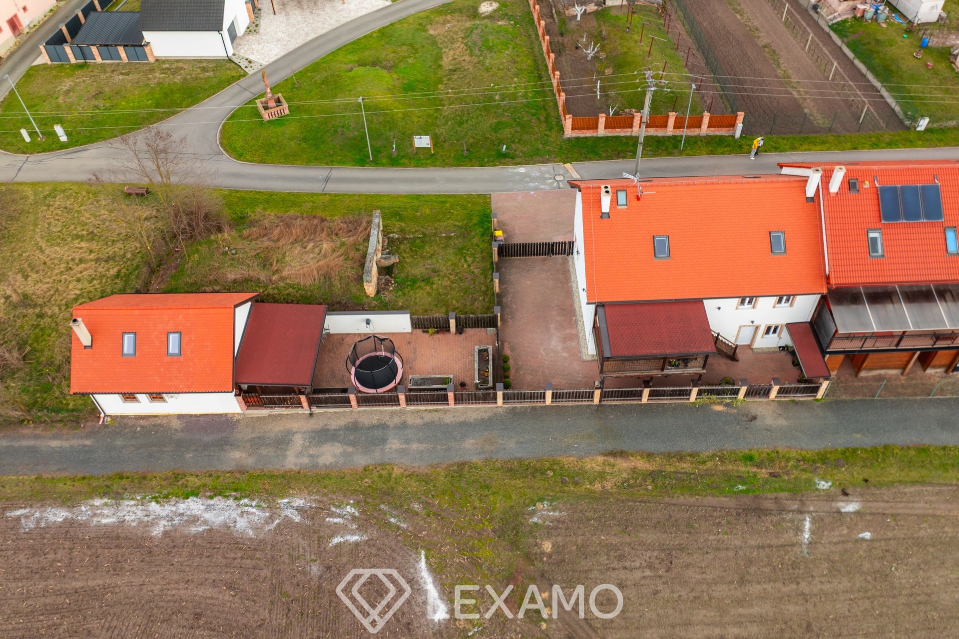 Pozemek je kompletně oplocený a umožňuje pohodlné parkování až pro čtyři vozidla.