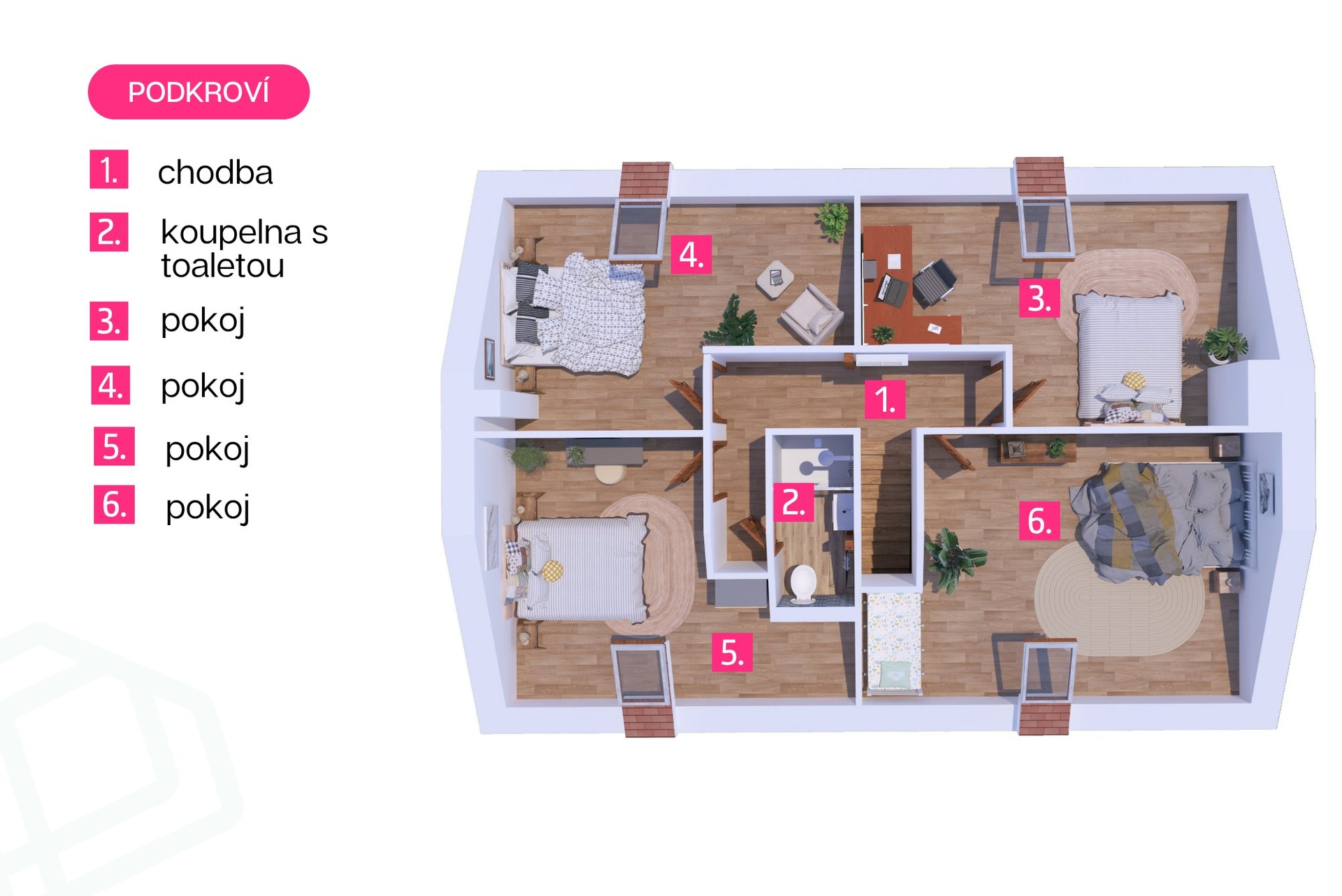 V horním podlaží jsou situovány další čtyři samostatné pokoje o velkorysých výměrách (cca 19–26 m²), které poskytují dostatek prostoru pro rodinu i ubytování více osob. Nechybí zde ani další koupelna.