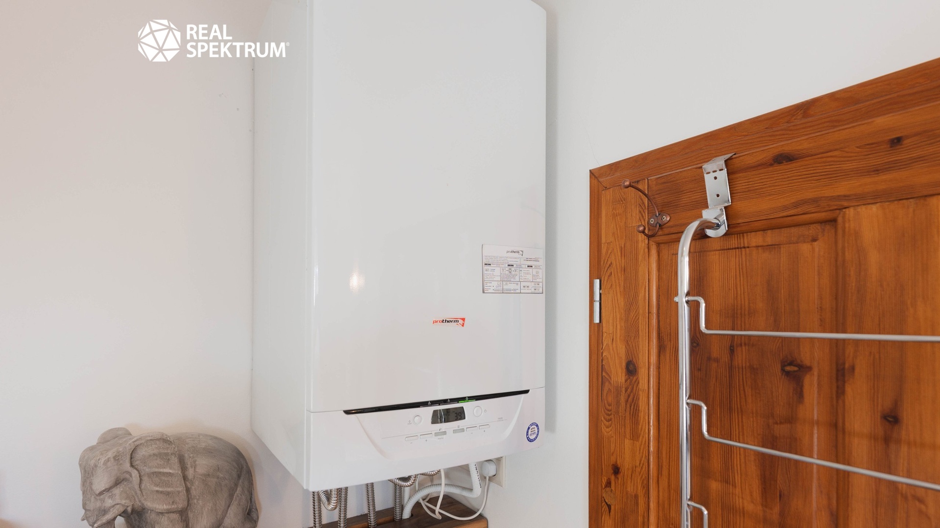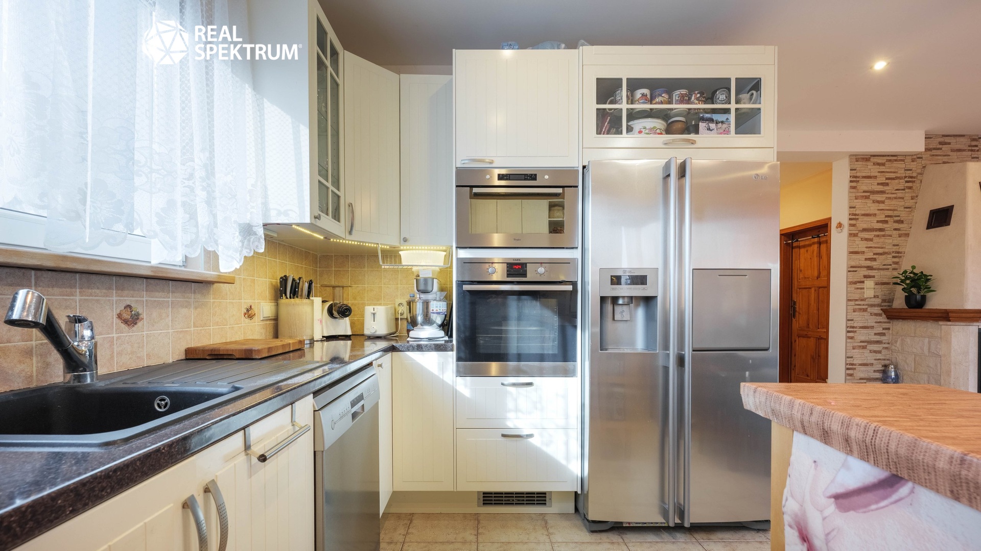 Vybavenost: el. 230/400 V, veřejný vodovod, plyn (topení - ústřední podlahové), kanalizace, klimatizace, alarm a kamerový systém.