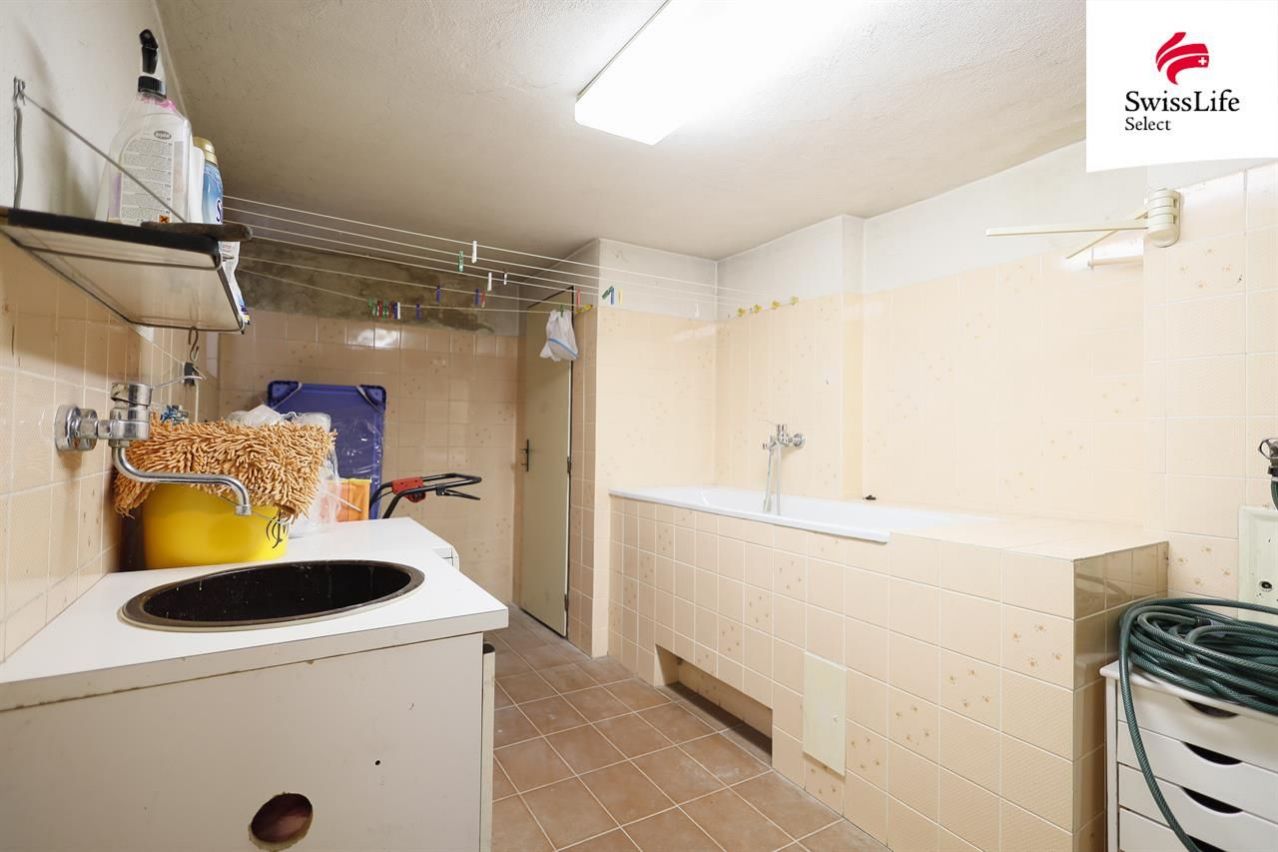 Než vejdeme do domu, můžeme zaparkovat na vlastním parkovacím stání hned před domem. Začneme-li dům procházet od nejníže položeného podlaží, najdeme zde garáž se dvěma místy k ustájení motorových členů domácnosti, uložit věci do prostorného sklepa, nebo budeme-li mít s sebou pořádně vyvenčeného čtyřnohého miláčka, můžeme jej nejprve osprchovat ve vaně takzvaného filtru, neboli koupelně pro větší špínu. V této místnosti také najdeme plynový kotel, který se nám bude starat o úsporné vytápění, díky společným zdem sousedů, s kterými se vzájemně ohříváme. Garáží můžeme projít i na zahradu, která je tak akorát. Nemusíte tu trávit hodiny sečením, ale místa pro nějakou tu čerstvou zeleninu do polévky, výběh pro domácího mazlíčka, nebo jen popracovní posezení u kávy tu budete mít dostatek.