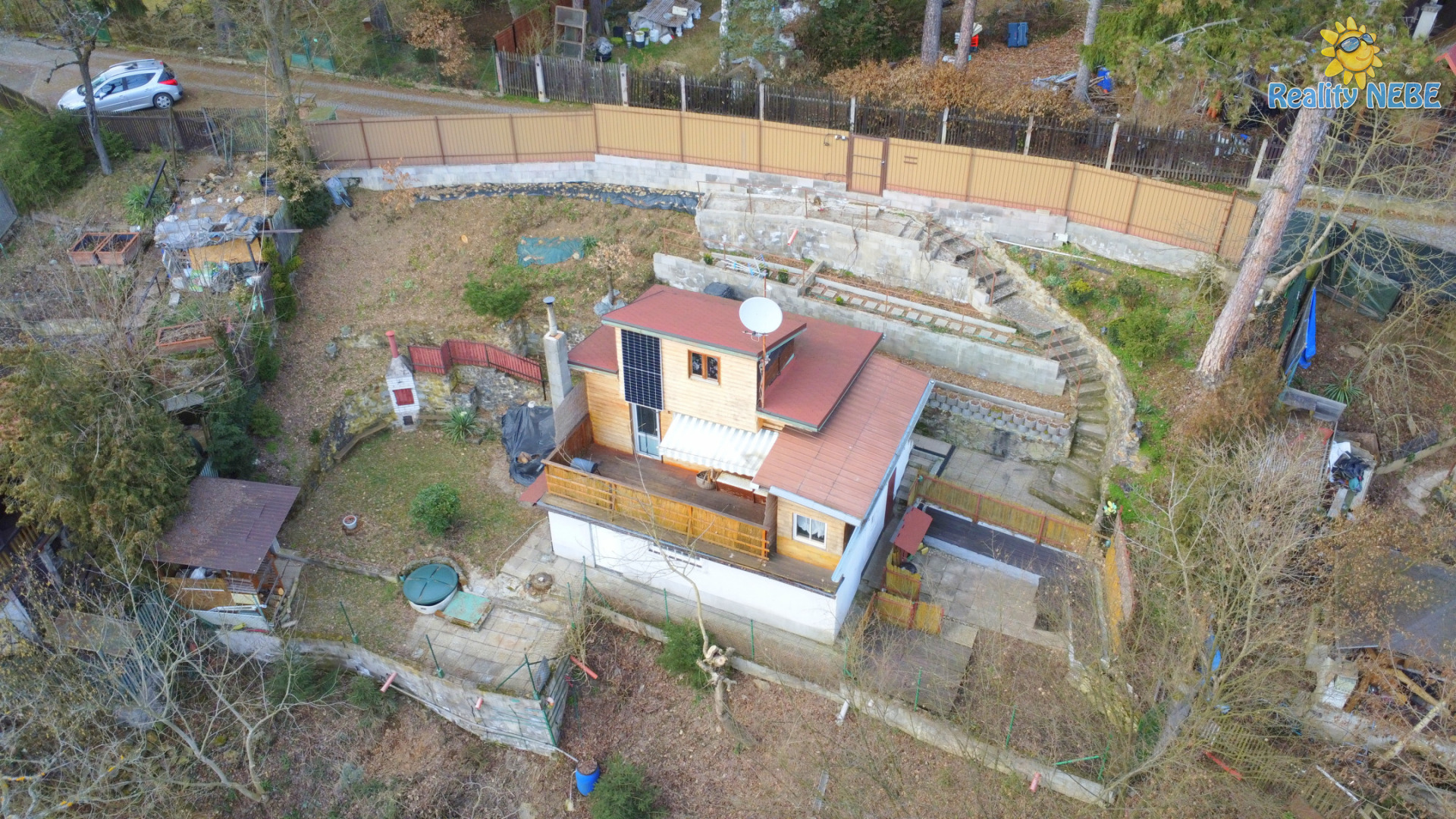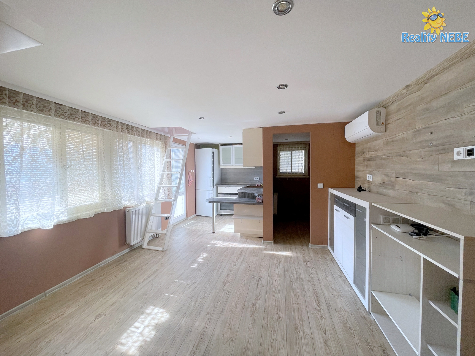 Přízemí – předsíň, obývací pokoj se zařízenou kuchyní s myčkou., lednicí, velká terasa a menší pokoj cca 4 m² (celkem cca 30 m²)