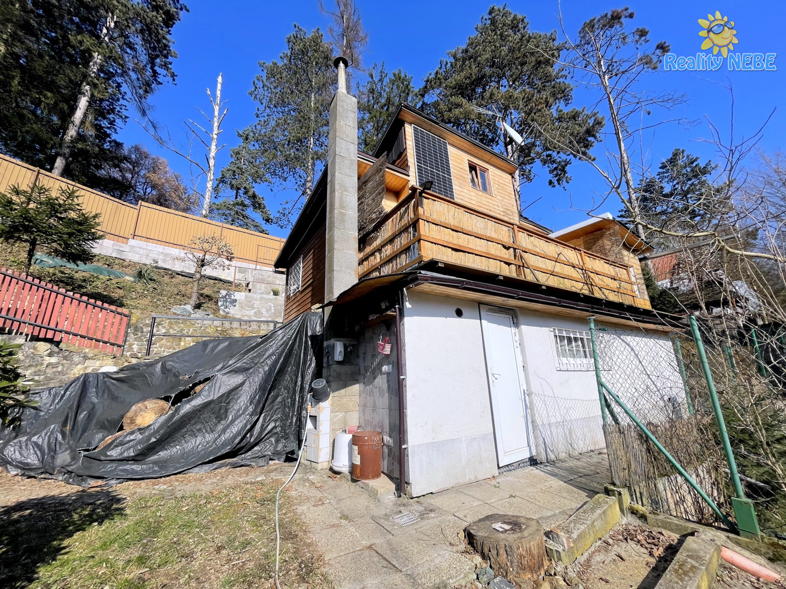 Vybavení zahrnuje kuchyňskou linku, koupelnu s žebrovým topením s WC a pračkou, bojler, saunu a udírnu, příprava na fotovoltaický systém.