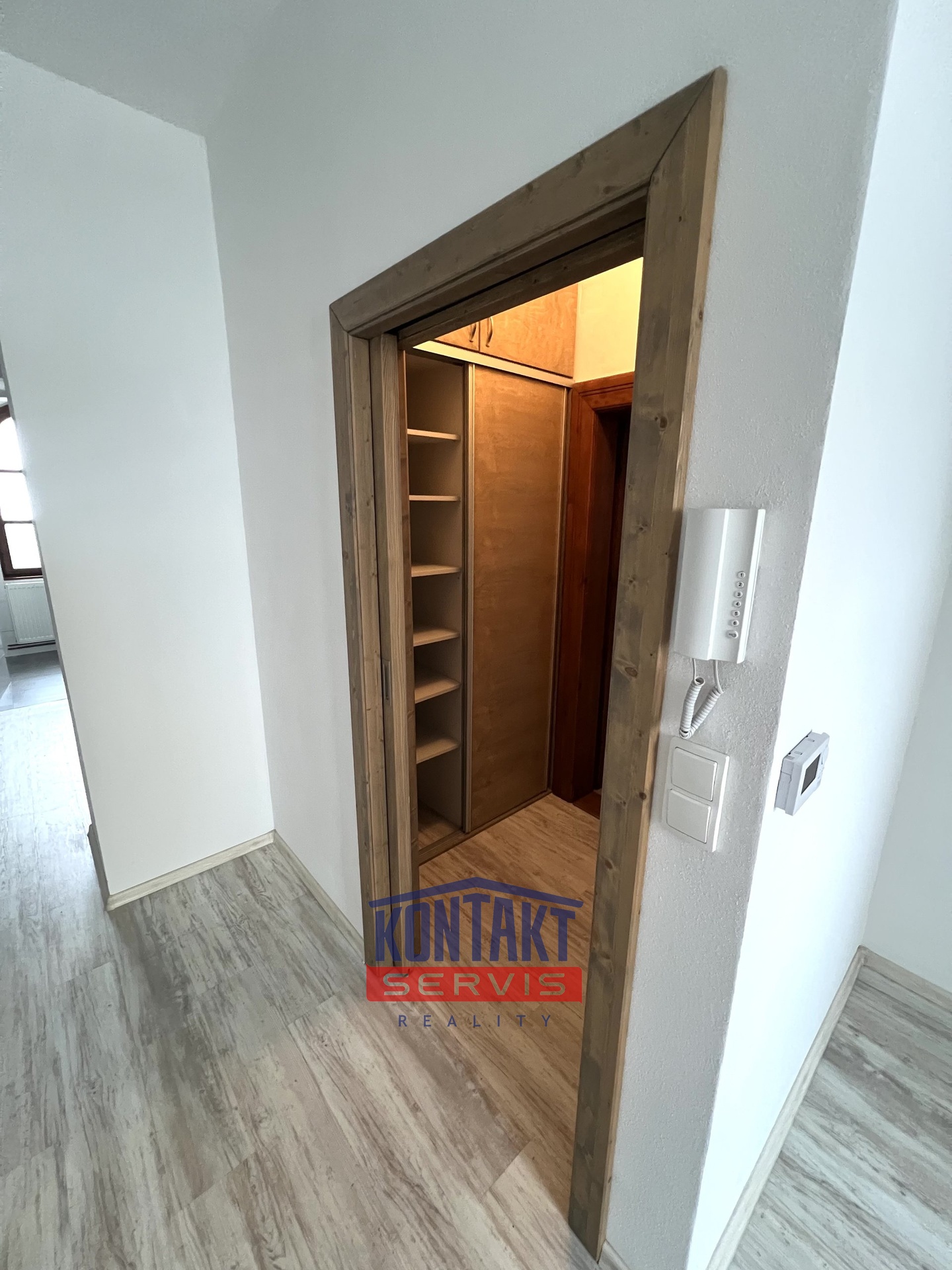 Velkým benefitem bytu je prostorná vestavěná skříň ve vstupní chodbě, která poskytuje dostatek prostoru a pomáhá udržet byt vzdušný a prostorný.
