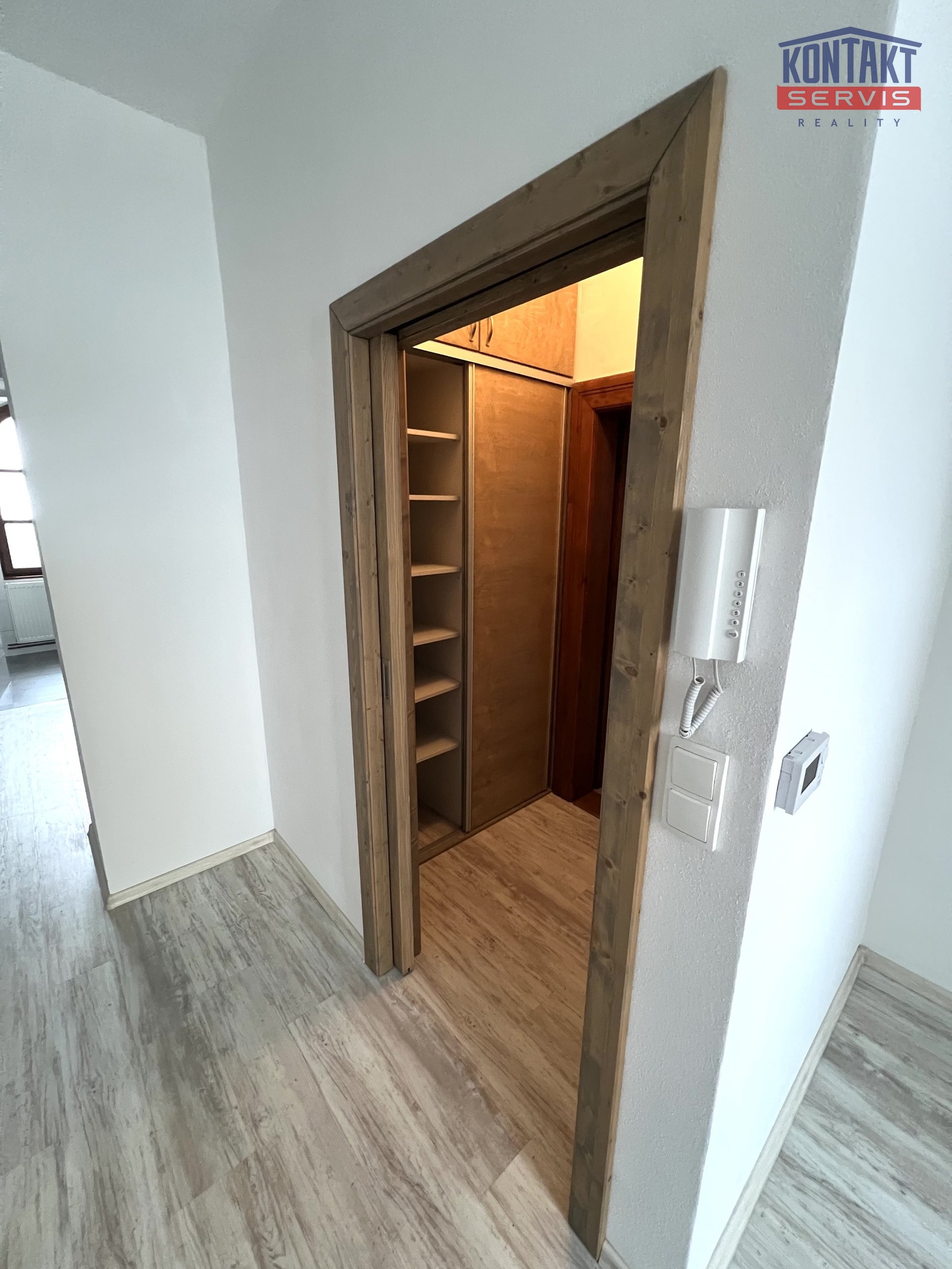 Velkým benefitem bytu je prostorná vestavěná skříň ve vstupní chodbě, která poskytuje dostatek prostoru a pomáhá udržet byt vzdušný a prostorný.