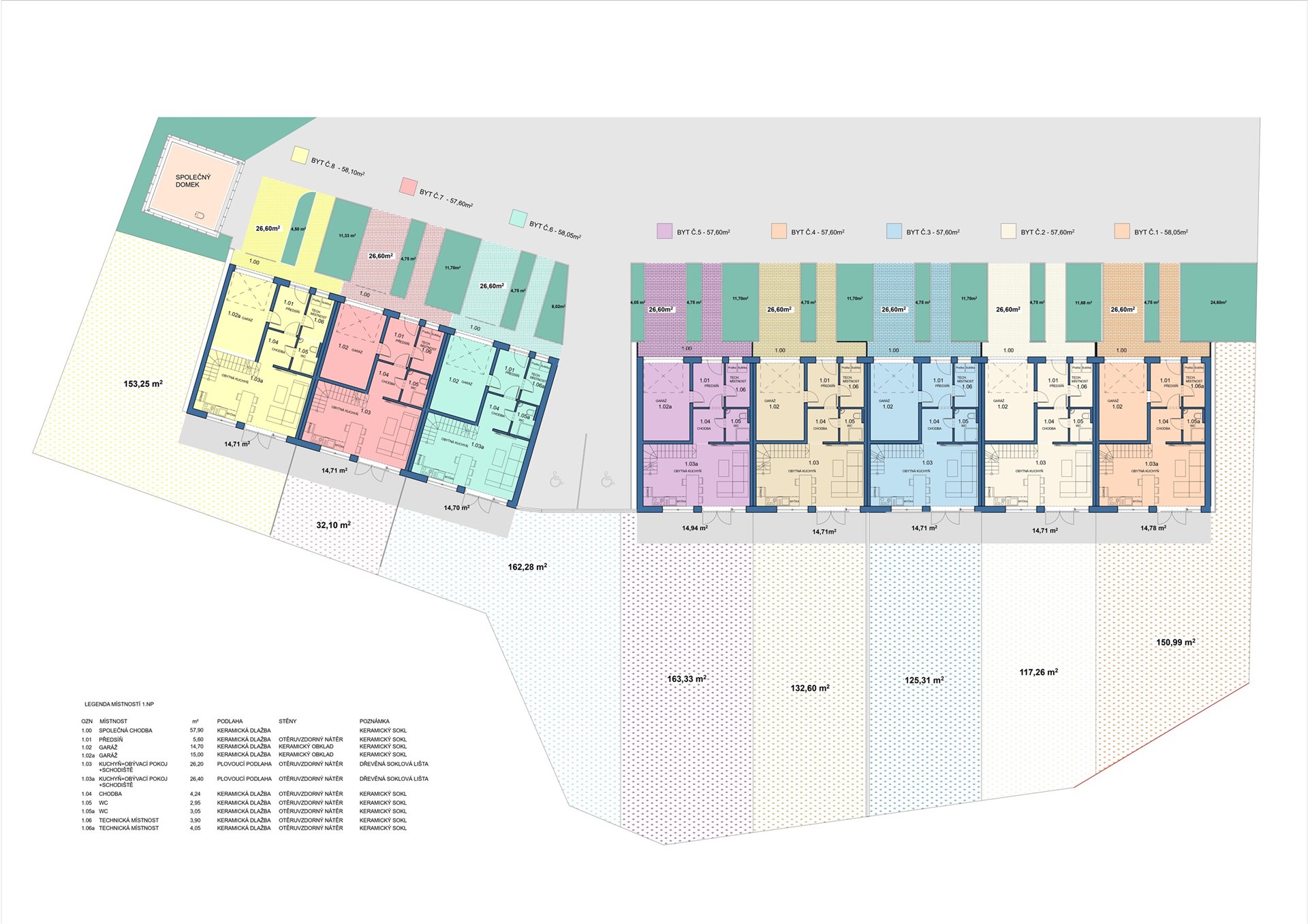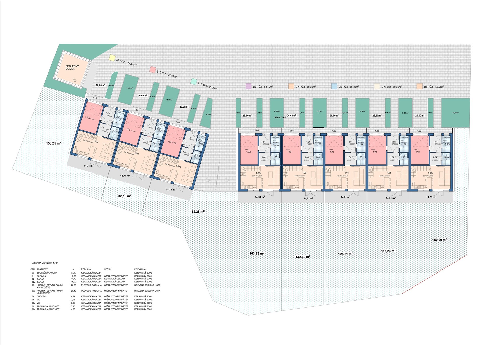 Každá bytová jednotka je samostatná a svojí dispozicí představuje samostatný řadový rodinný dům. Dispozičně je každý dům 4 + kk s terasou, o výměře cca 130 m2 užitné plochy včetně garáže, každý dům je rozdělen do 2 NP, má samostatný vchod a vlastní část pozemku (zahrady a prostoru před vchodem a garáží – parkovací stání), přičemž výměra pozemků se pohybuje cca 200 m2. Každý dům má 2 koupelny propojené s WC, 3 samostatné ložnice, obývací pokoj propojený s kuchyňským koutem a přímým vstupem na terasu a vlastní garáž.