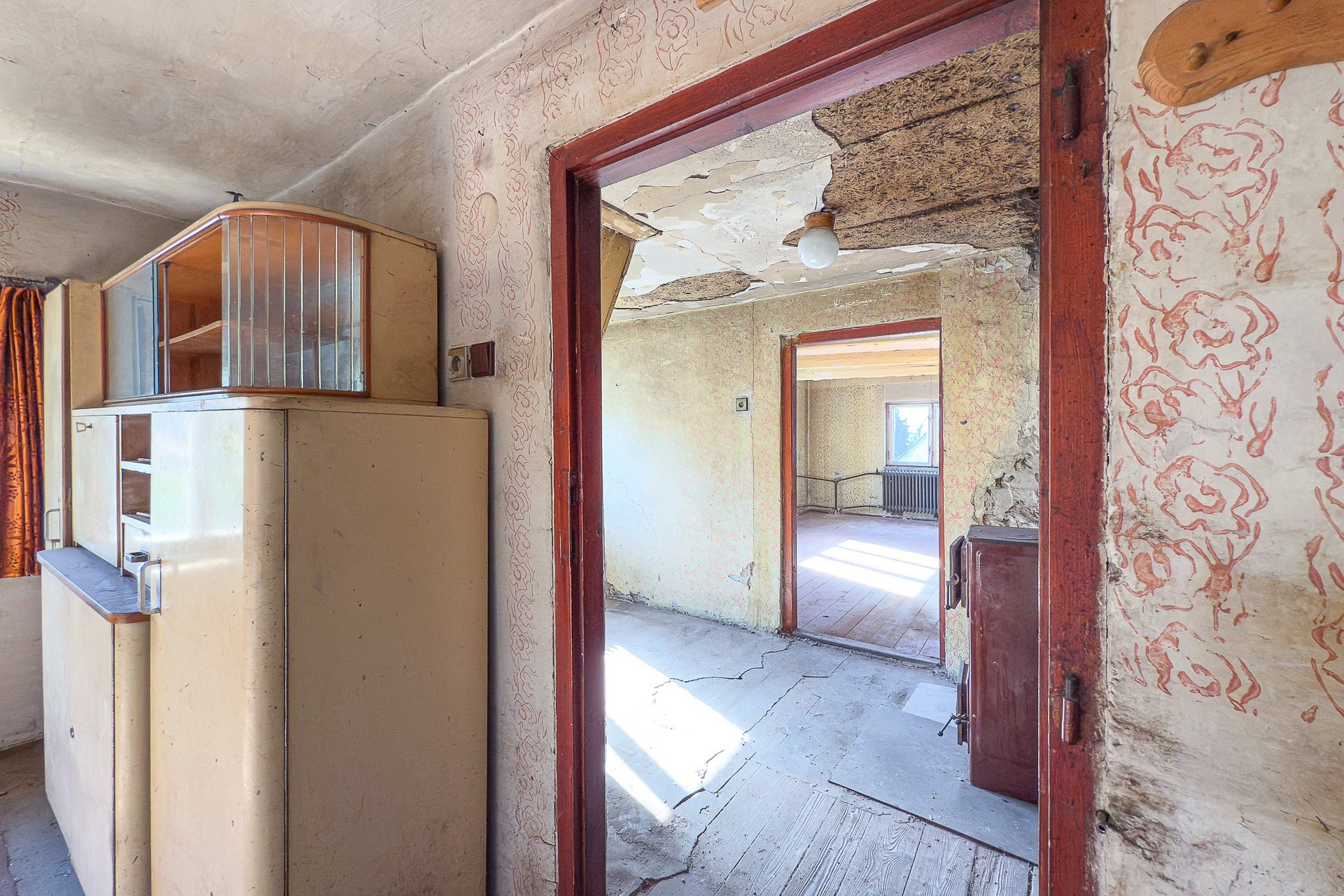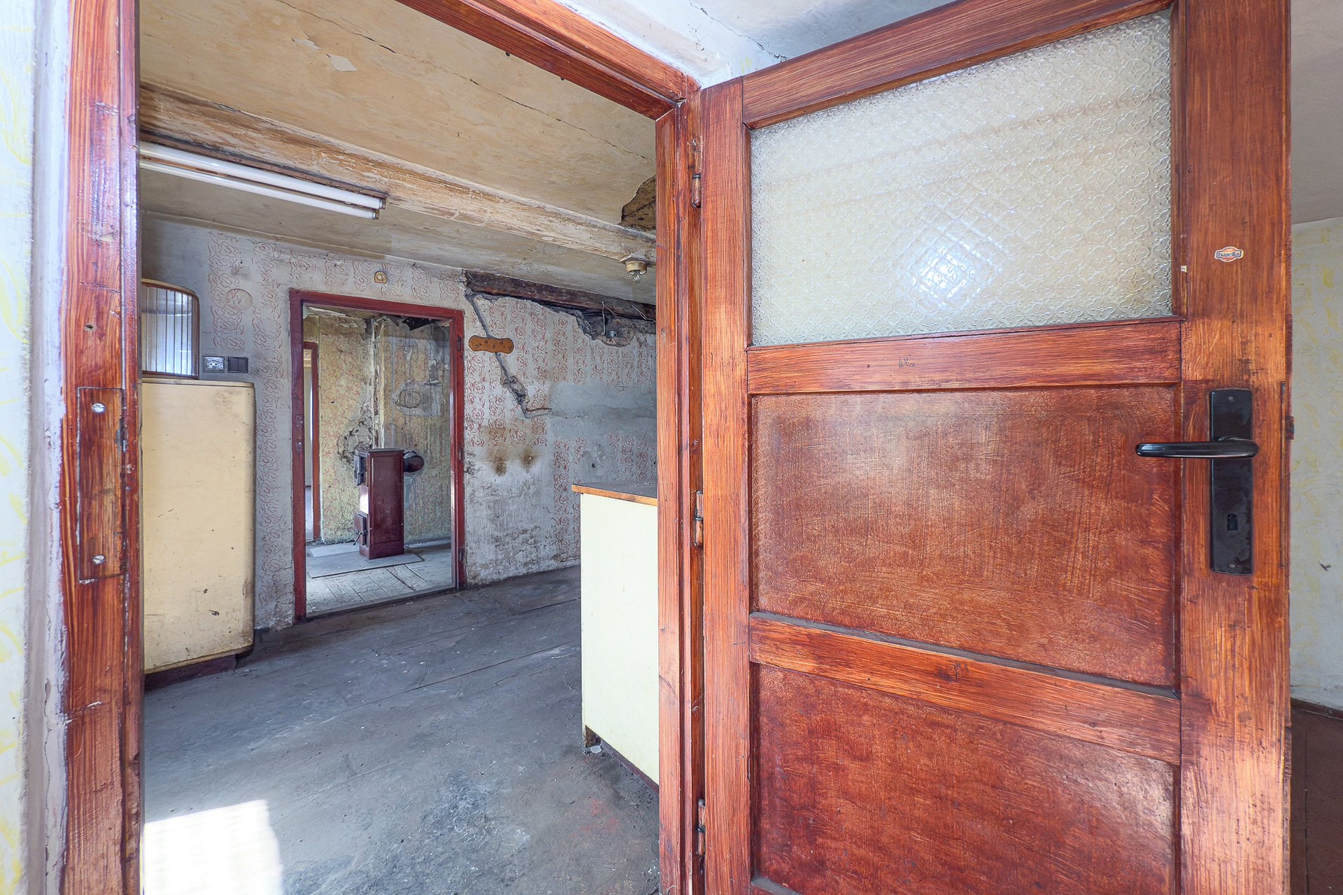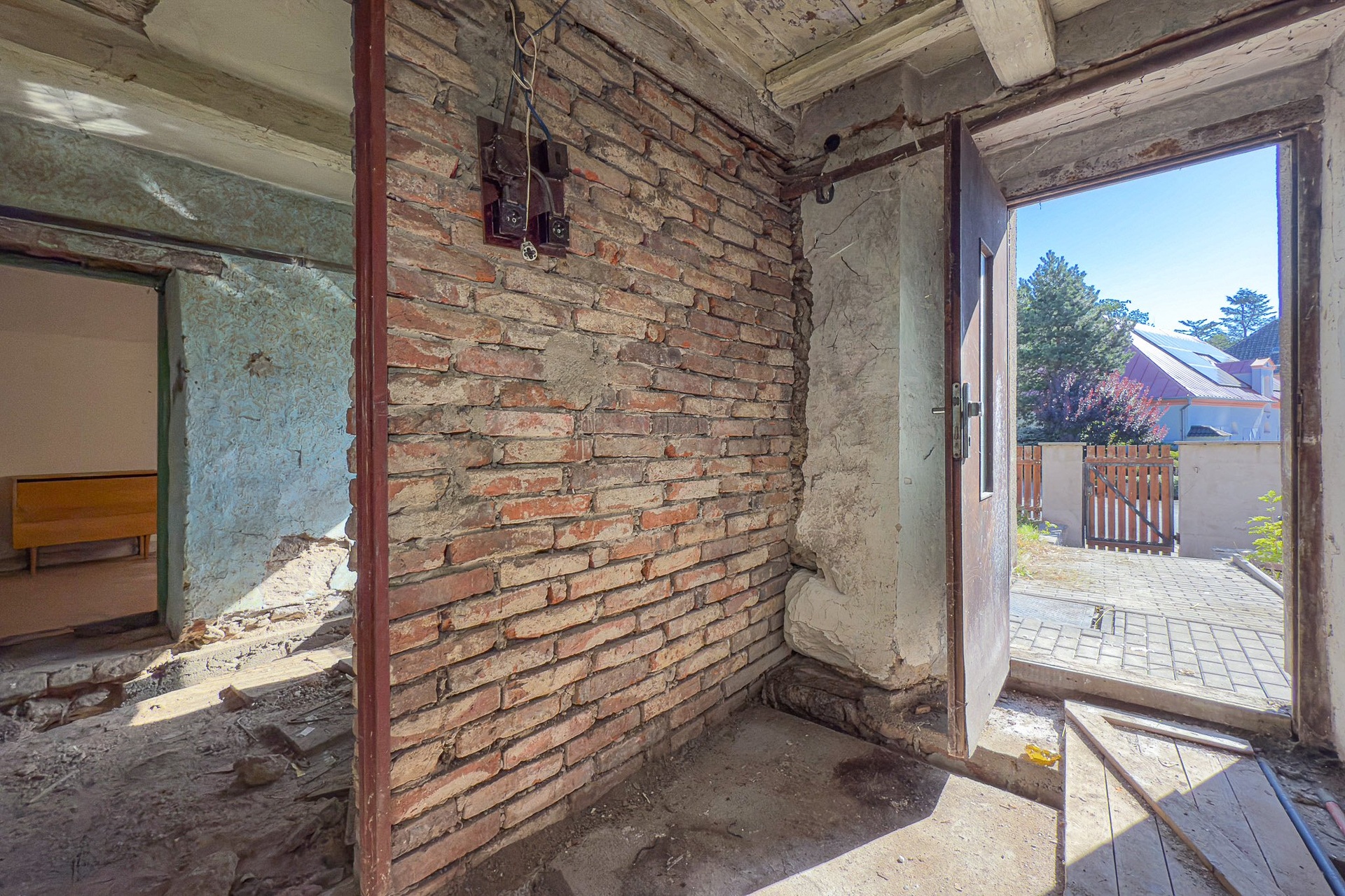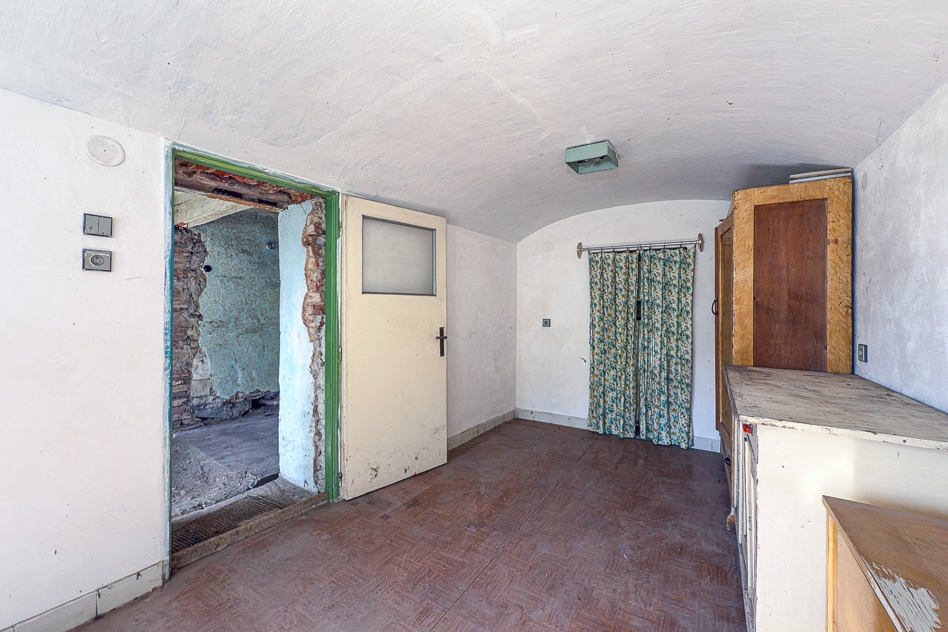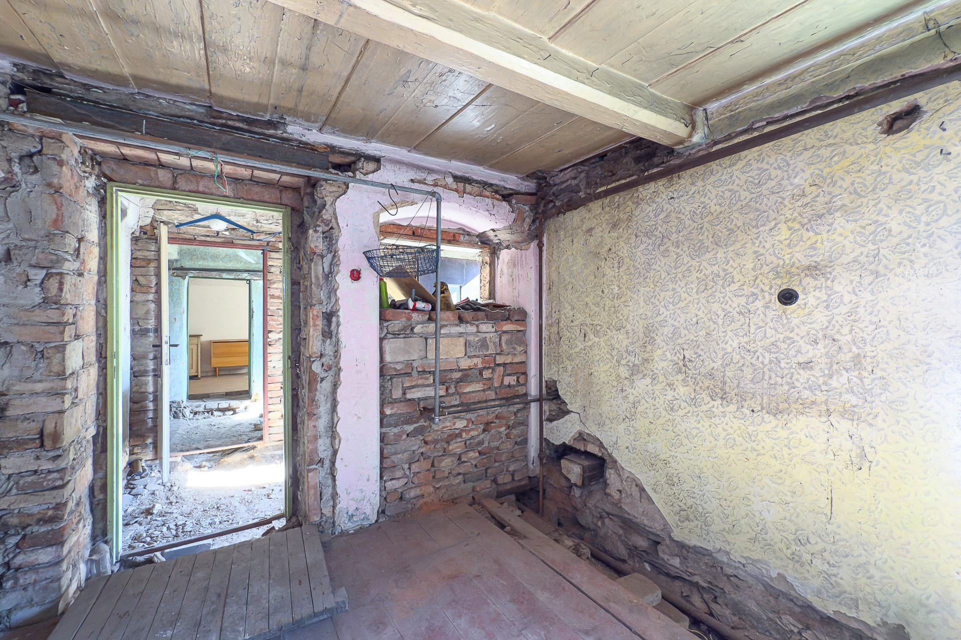 Patro: prostorná místnost, bývalá kuchyně, další menší pokoj (dispozice odpovídá přízemí)
