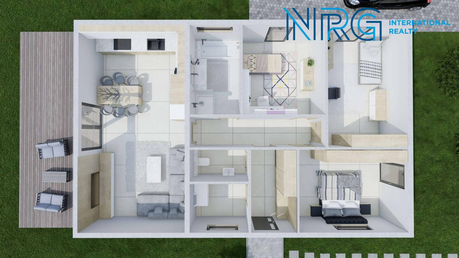 Obývací pokoj, z něhož je přímý vstup na terasu. Dále dům nabízí ložnici, dva dětské pokoje, šatnu, samostatné WC, koupelnu s vanou i sprchovým koutem a technickou místnost.