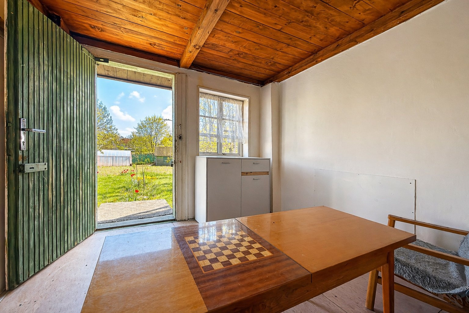 Na zahradě zůstává také vybavení v chatce i v kůlně, takže nový uživatel může zahradu bez větších investic rovnou začít využívat.