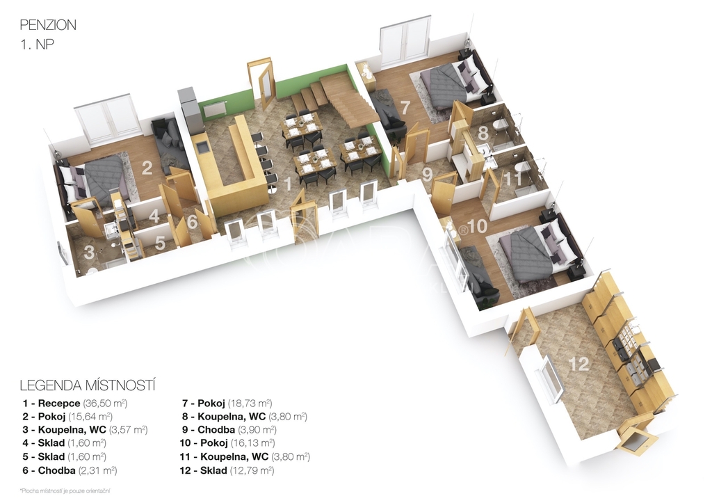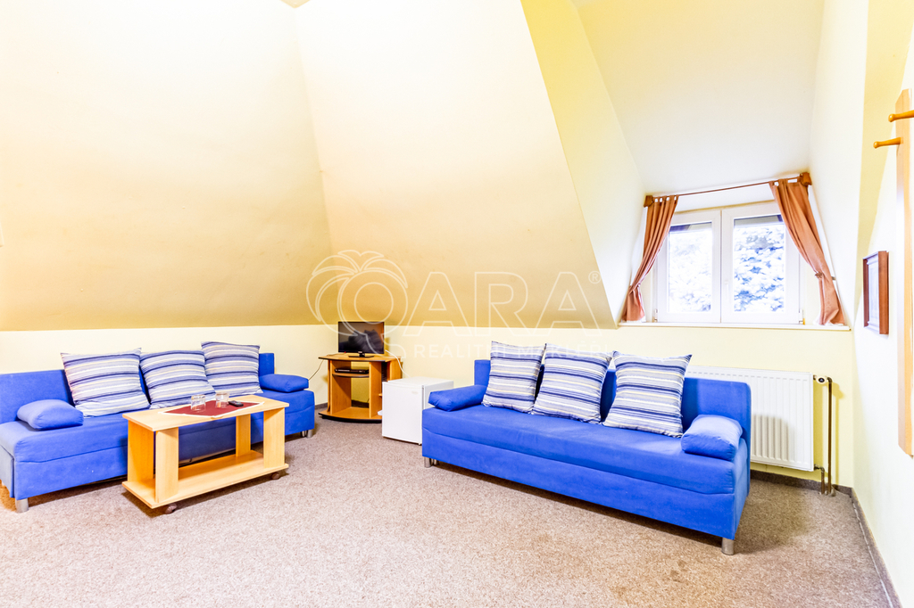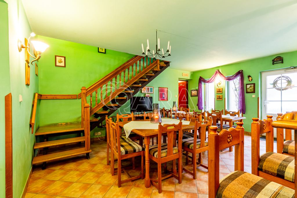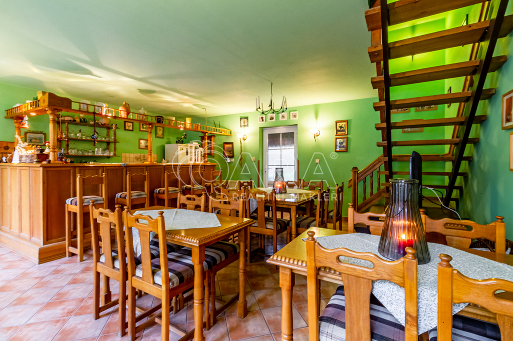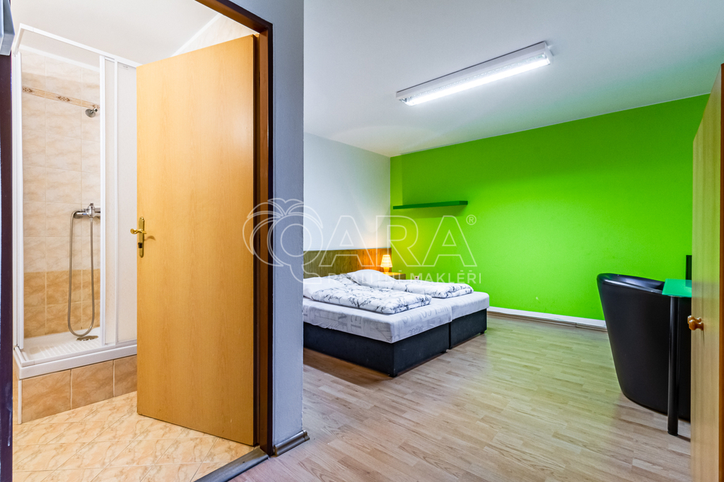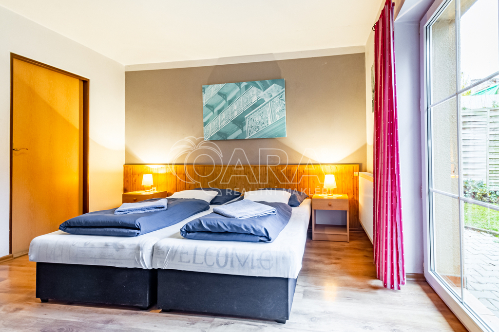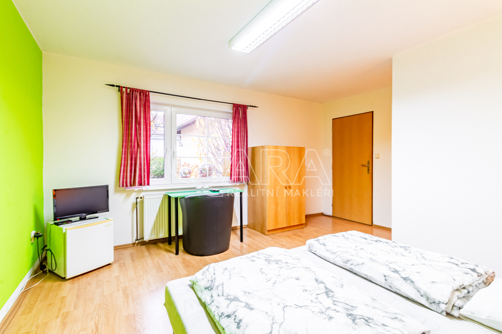Penzion s recepcí (215 m²) – 5 pokojů a 1 apartmán, každý s vlastní koupelnou, provozně připravený. Na katastru vedeno jako ubytovací zařízení, možnost rekolaudace. Pět plně zařízených pokojů a jeden apartmán, každý s koupelnou. V přízemí recepce, bar, jídelna, terasa, v patře další pokoje. Technické zázemí včetně prádelny.