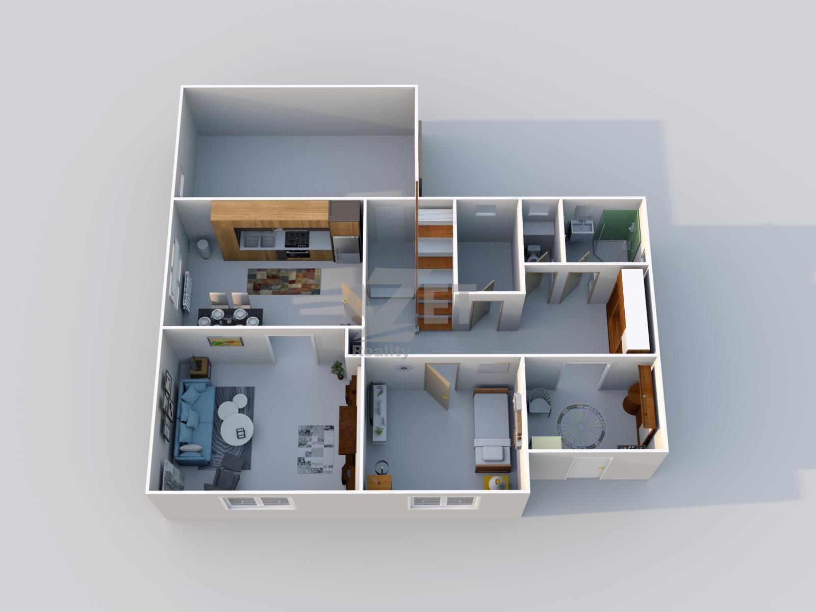 1.NP - zádveří, předsíň, schodiště do 2.NP, chodba do sklepa/garáže, samostatné WC Kombi, koupelna se sprchovým koutem, komora, obývací pokoj, ložnice, kuchyně, garáž (sklad)