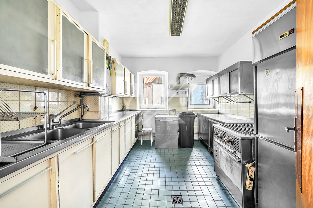 Dispozice přízemí zahrnuje halu, profesionálně vybavenou kuchyni, společenskou místnost s barem, a dva pokoje s vlastními koupelnami a WC. Dále se zde nachází samostatné WC a sklad pro lyže či kola. V patře domu jsou dvě koupelny a WC, šest pokojů a samostatný apartmán 2 (3) + 1 s koupelnou, vanou a WC, ze kterého je krásný výhled na přilehlý splav. Dům byl částečně modernizován, což zahrnuje zavedení plynu, nové rozvody vody a elektřiny, výměnu většiny oken a nové okapy. Součástí domu je prostorný kamenný sklep vhodný pro vybudování vinárny a vnější plášť domu je vhodný pro rekonstrukci.