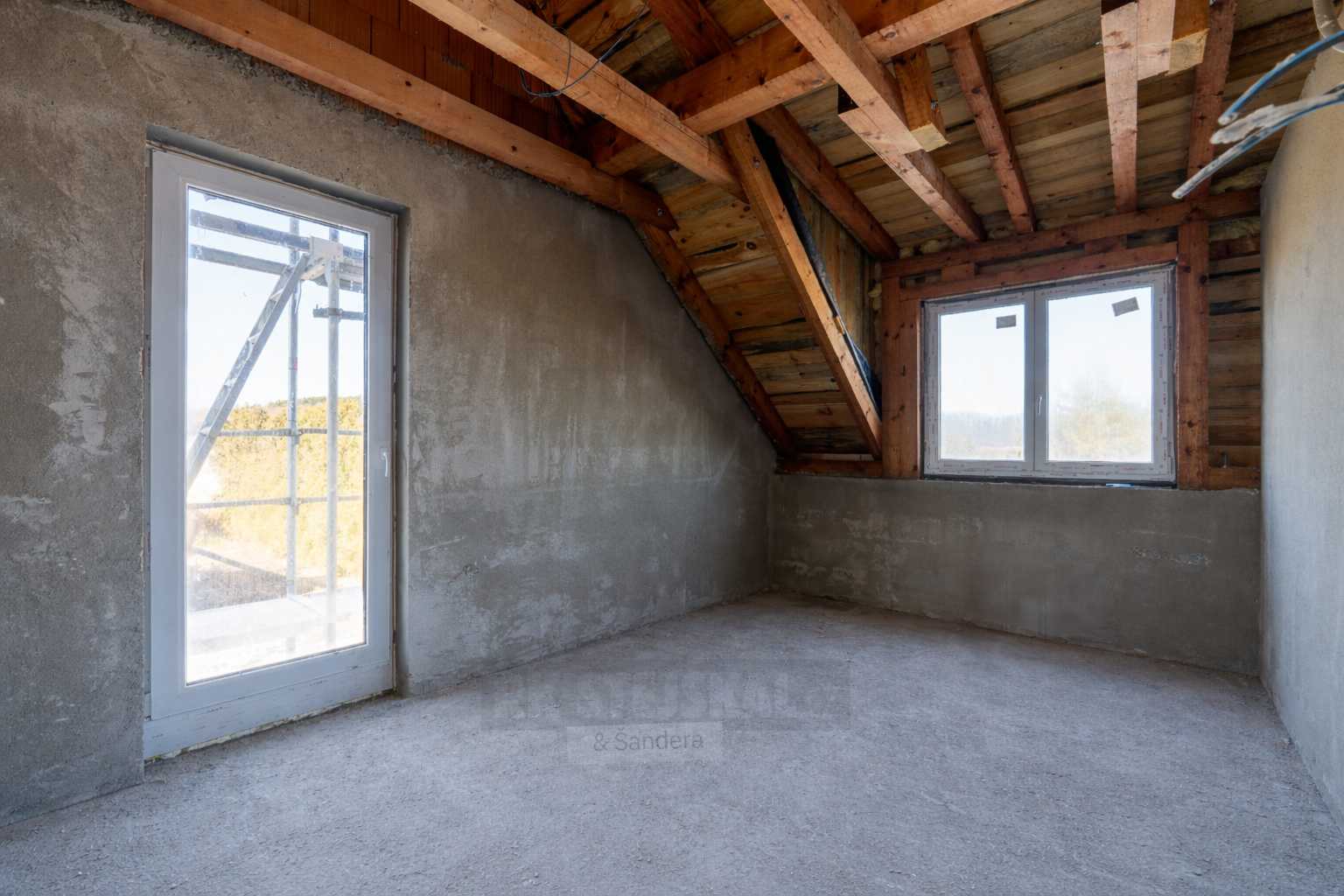 Není v ceně: koupelny, podlahy, interiérové dveře, plot, finální povrch terasy a zahradní prvky – interiér si tak můžete dokončit přesně podle vlastních představ.